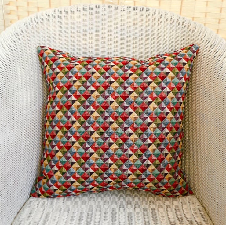 A handmade multi coloured Cushion Cover, with stitched and overlocked seams, and zip fastening at the bottom.