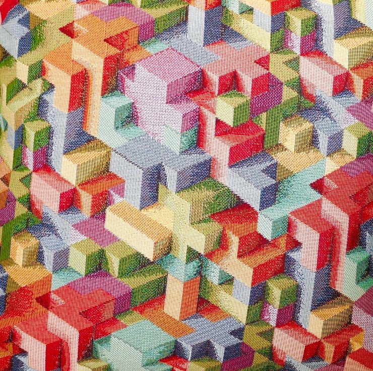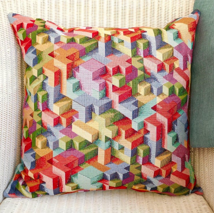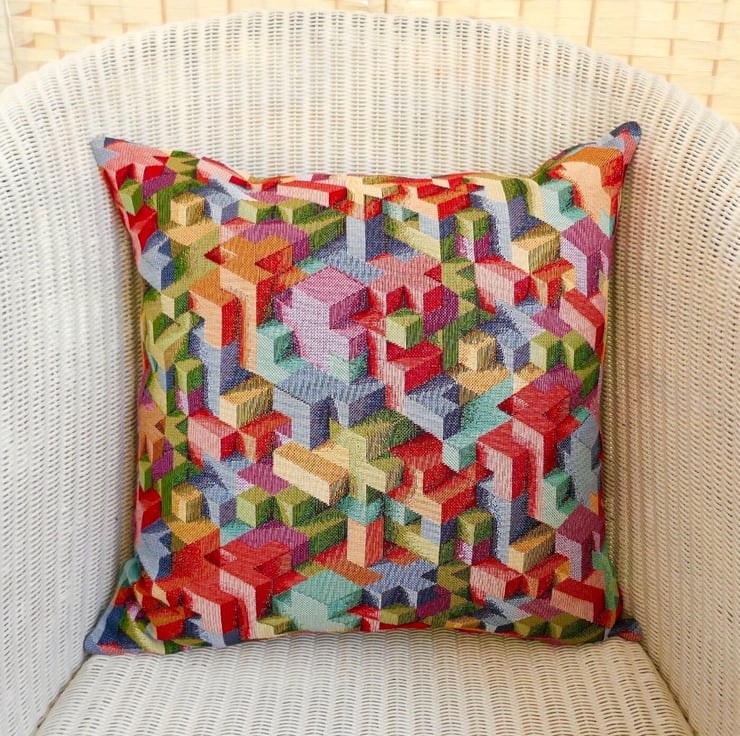 A handmade multi coloured Cushion Cover, with stitched and overlocked seams, and zip fastening at the bottom.