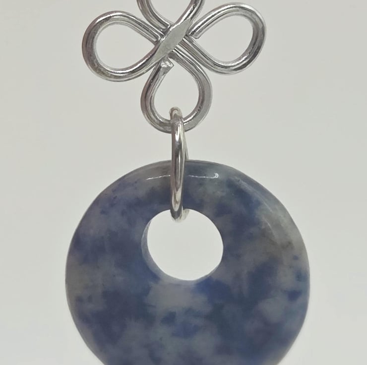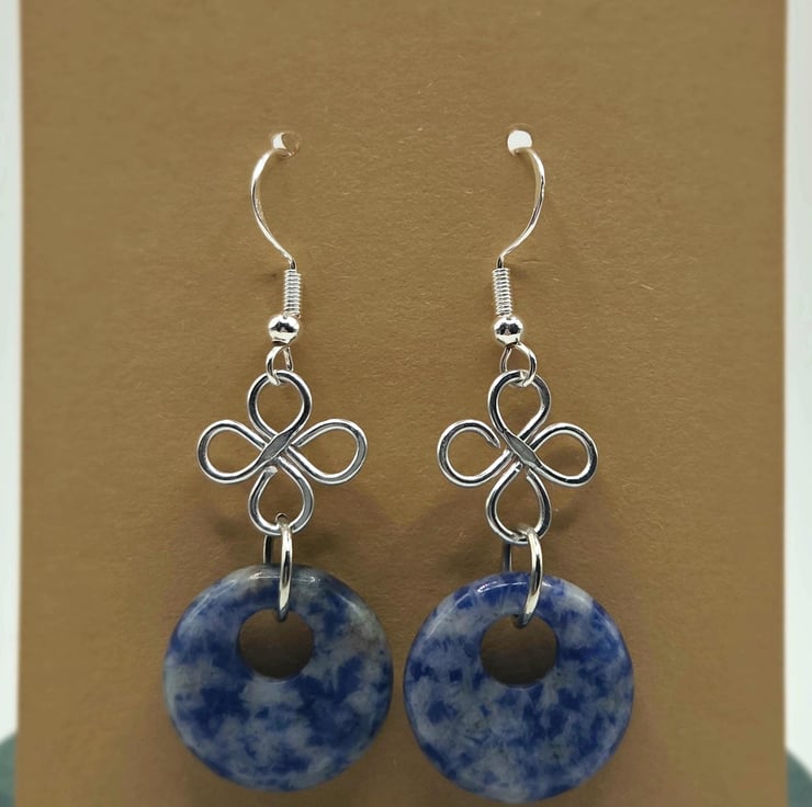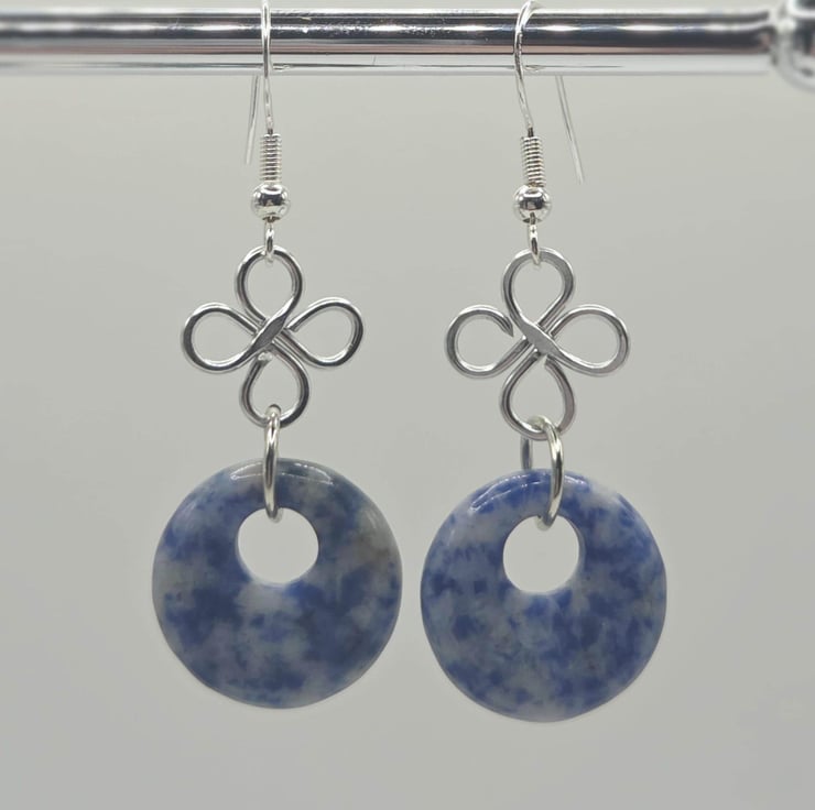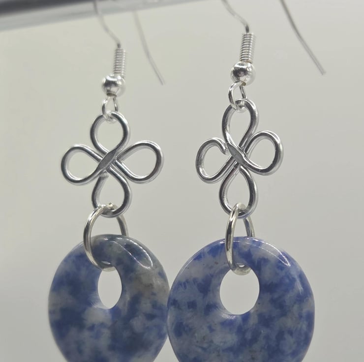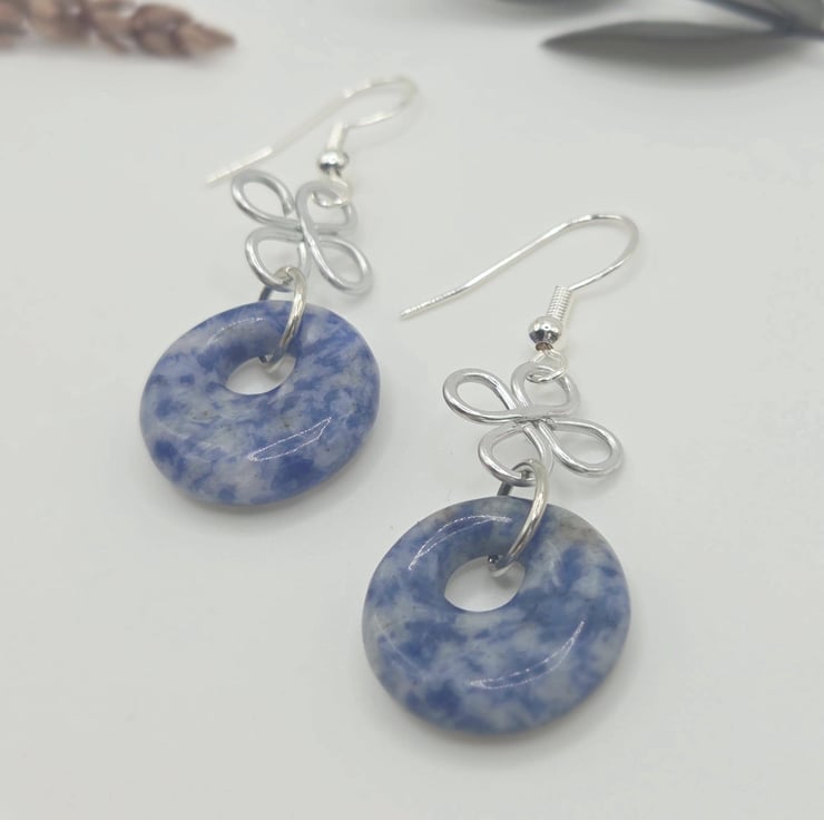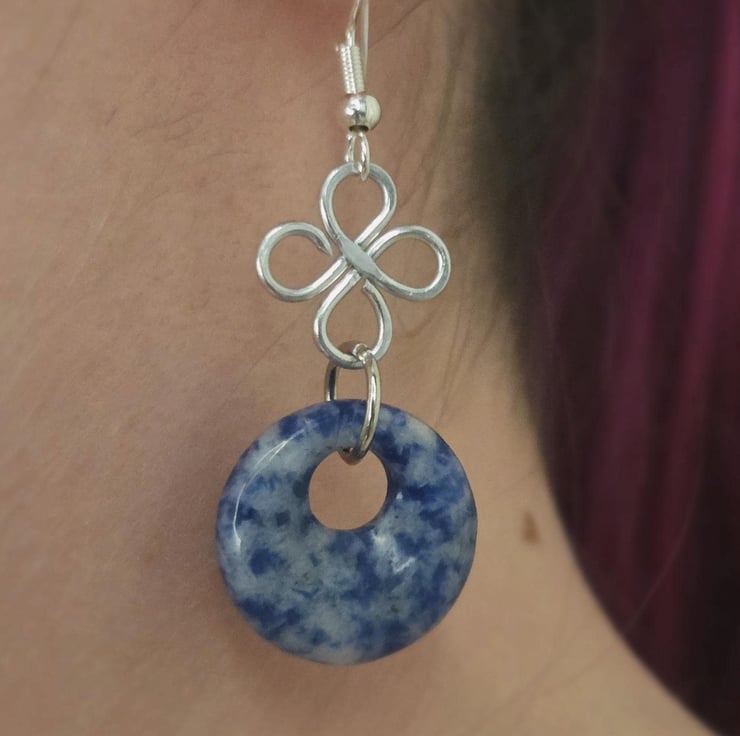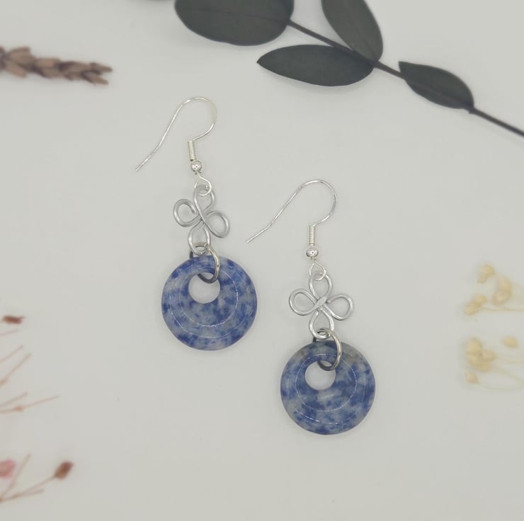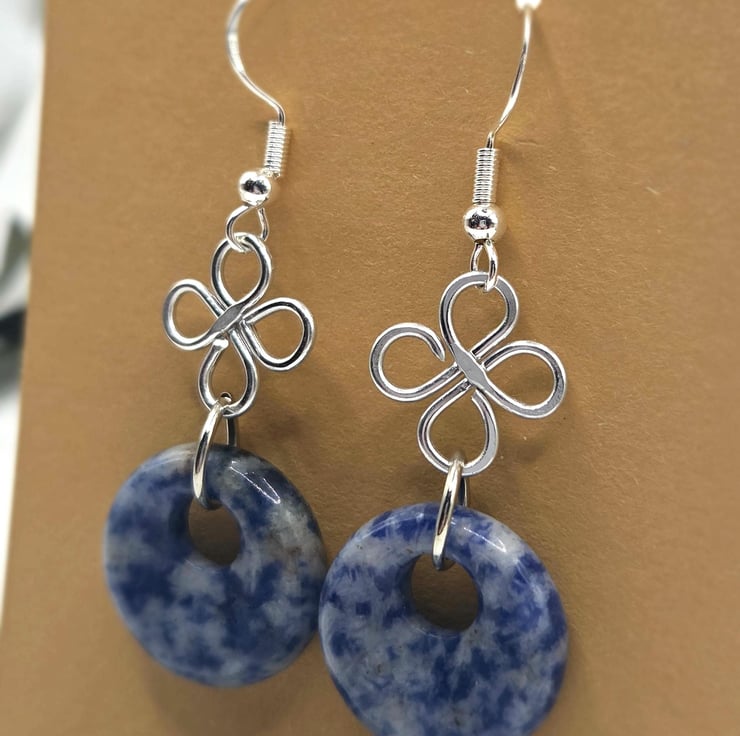 Handmade silver wire-wrapped clover charm dangle earrings with blue sodalite polished donut beads.