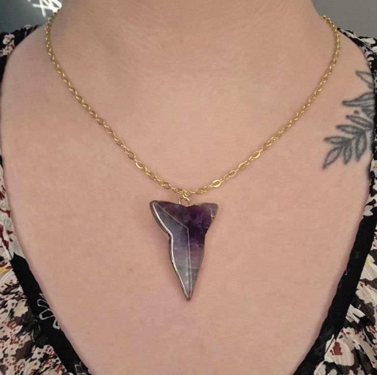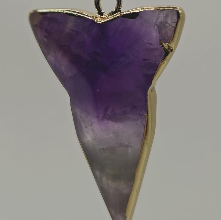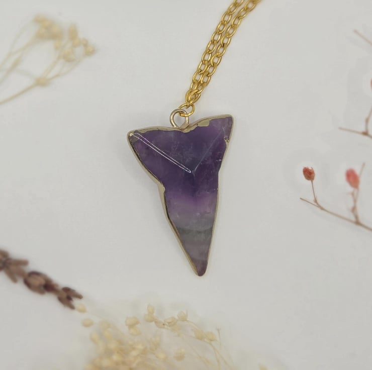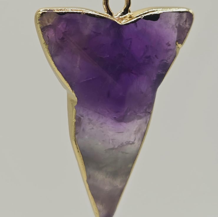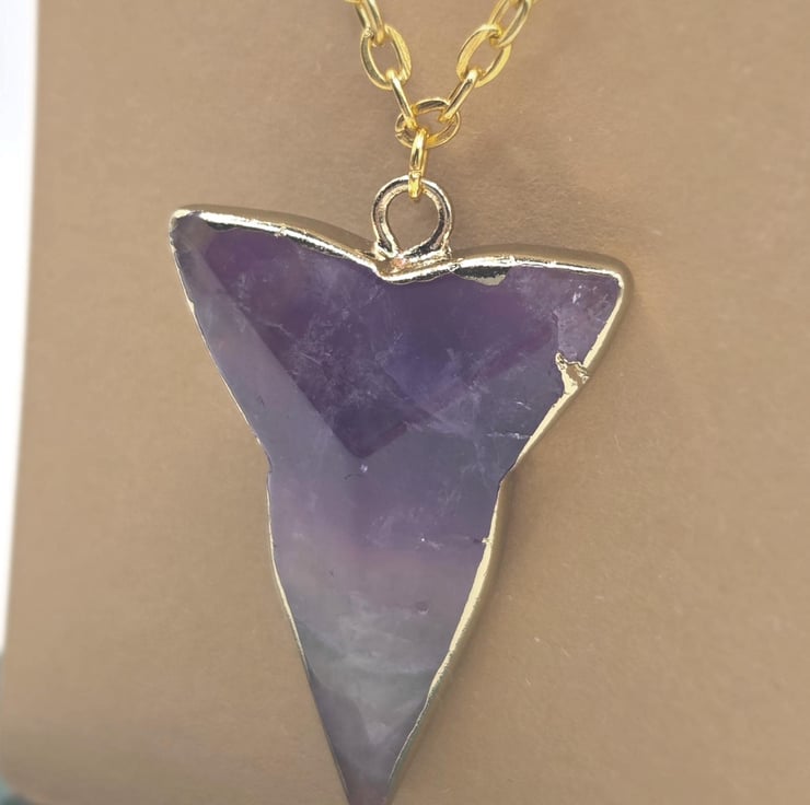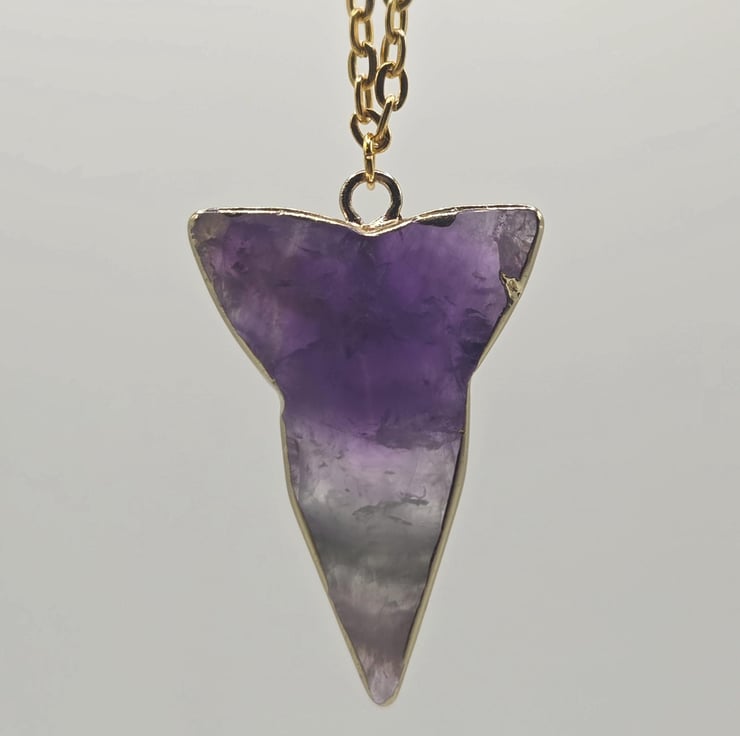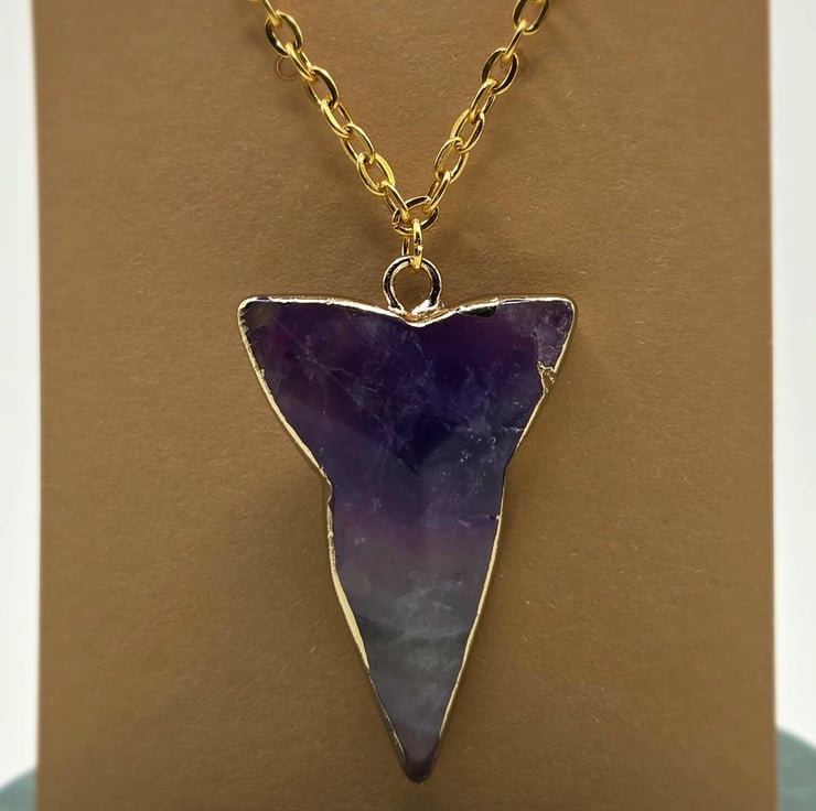 Gold plated chain necklace, featuring a light gold-edged, polished amethyst arrowhead pendant.