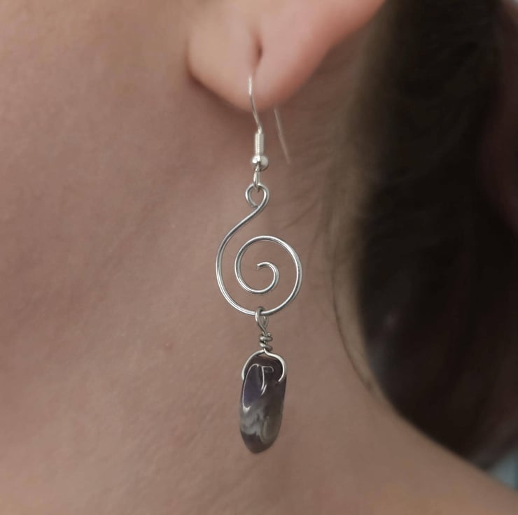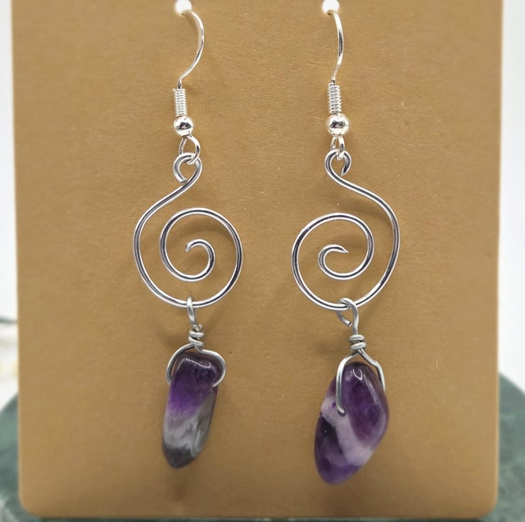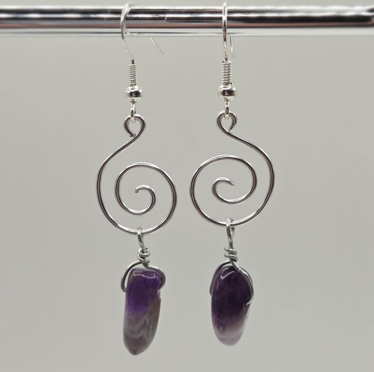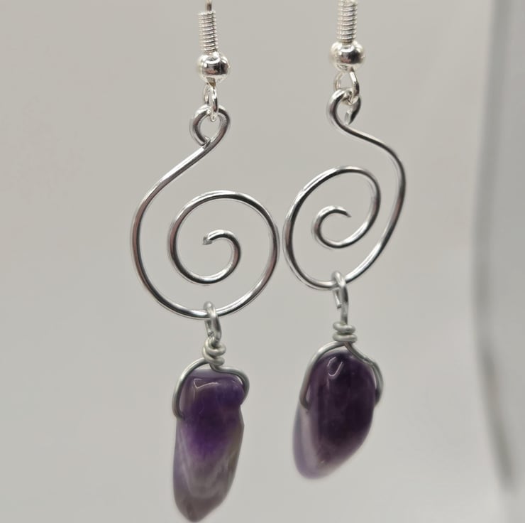 Handmade silver wire-wrapped spiral dangle earrings, featuring large polished amethyst gemstone chunkspoints.