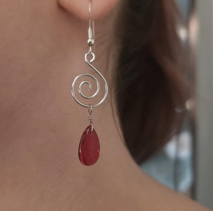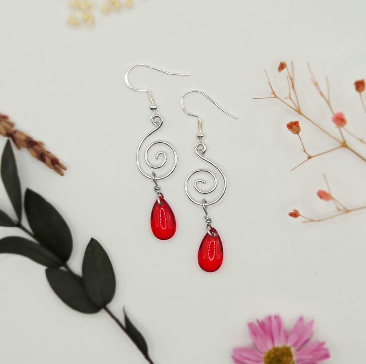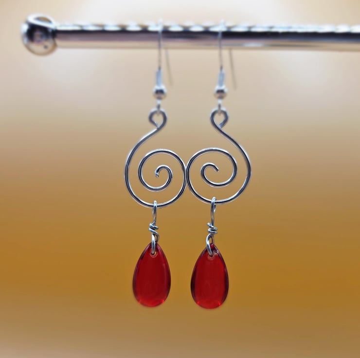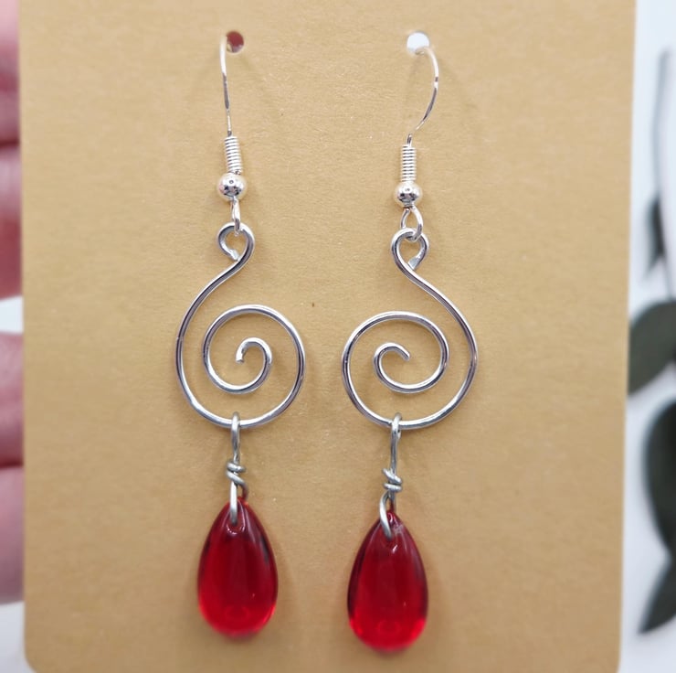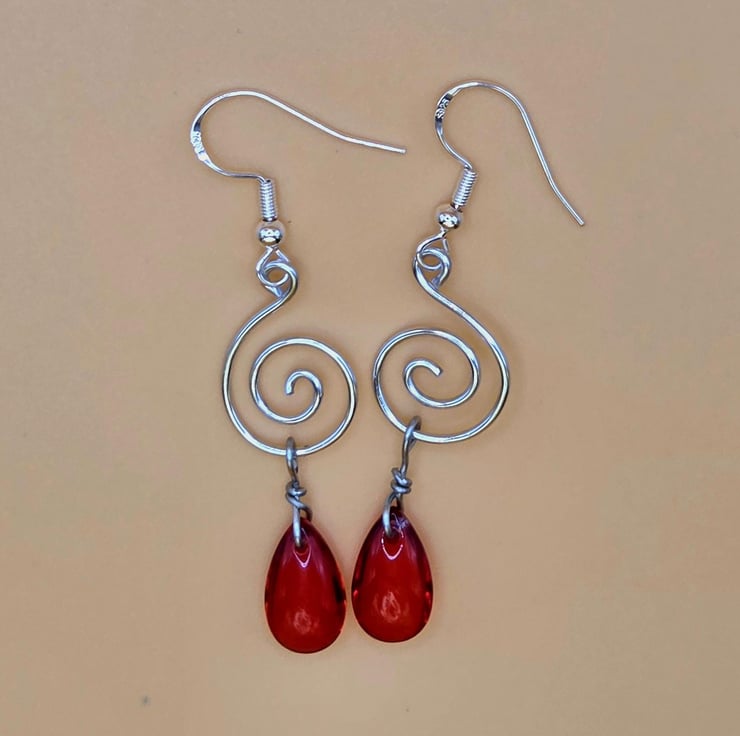 Handmade silver spiral dangle earrings, with red briolette glass beads.