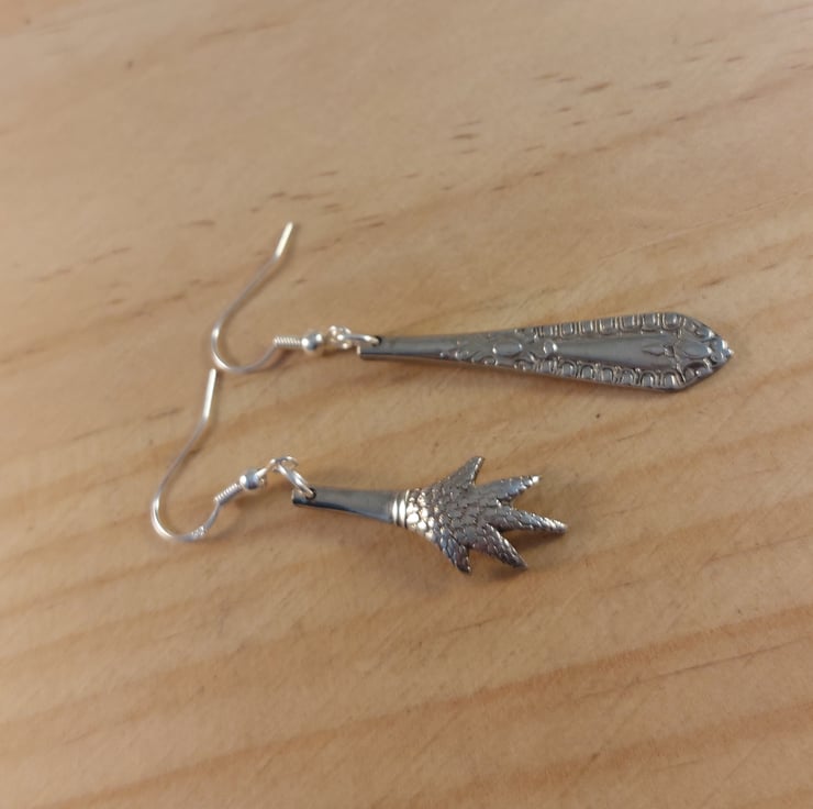 One handle of a pair of sugar tongs has been carefully pierced around, and then cut into two equal pieces. A hole has been drilled in the top so they can be attached to silver plated ear wires.