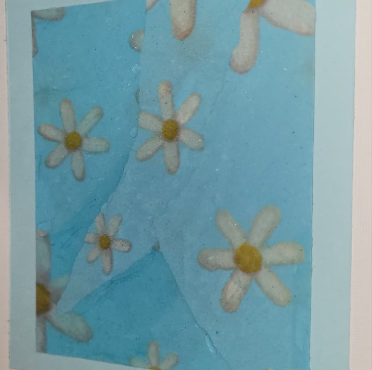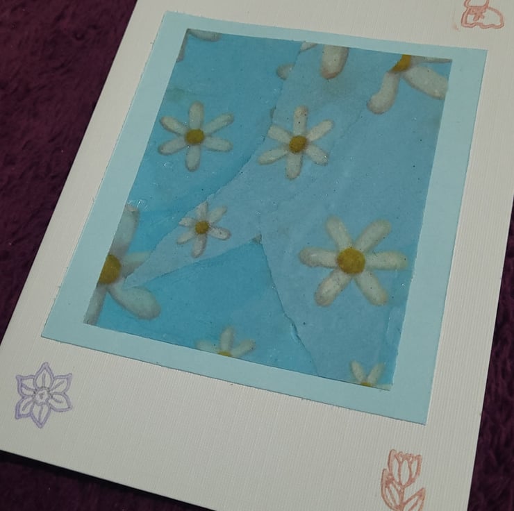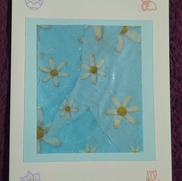 Spring themed handmade blank card glossy tissue paper design mounted on a pastel blue card, onto an A6 white card. With ink stamps of spring flowers and easter designs.