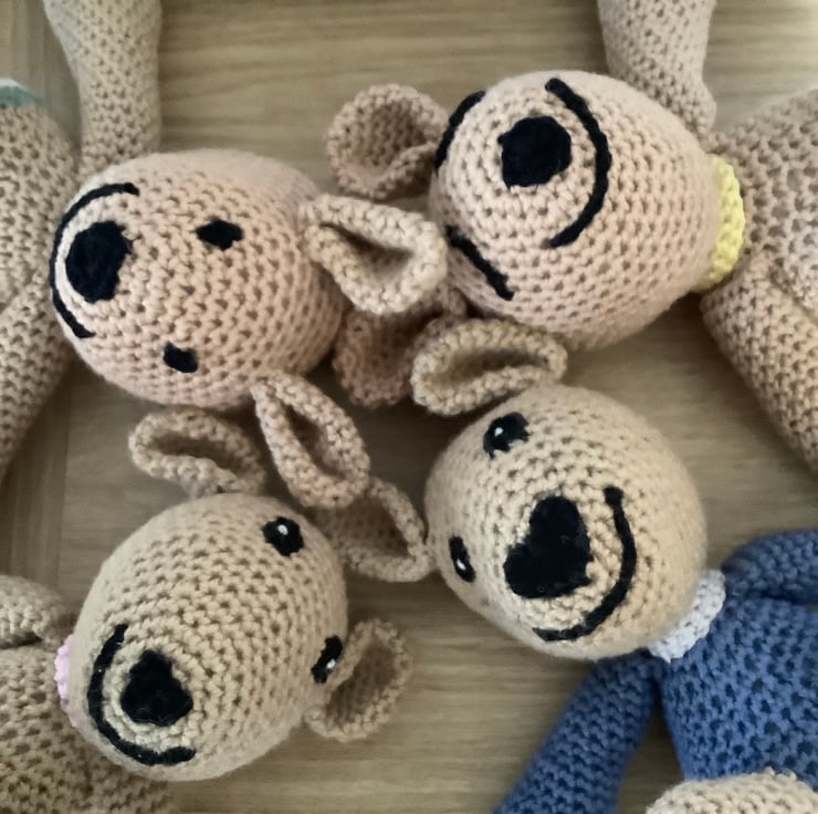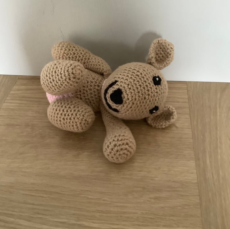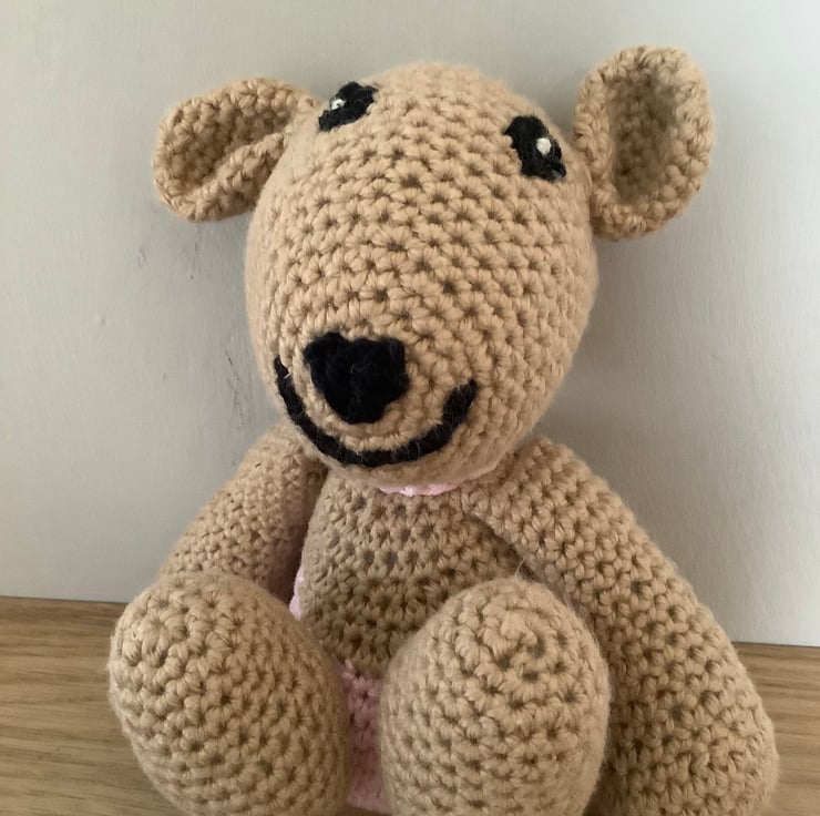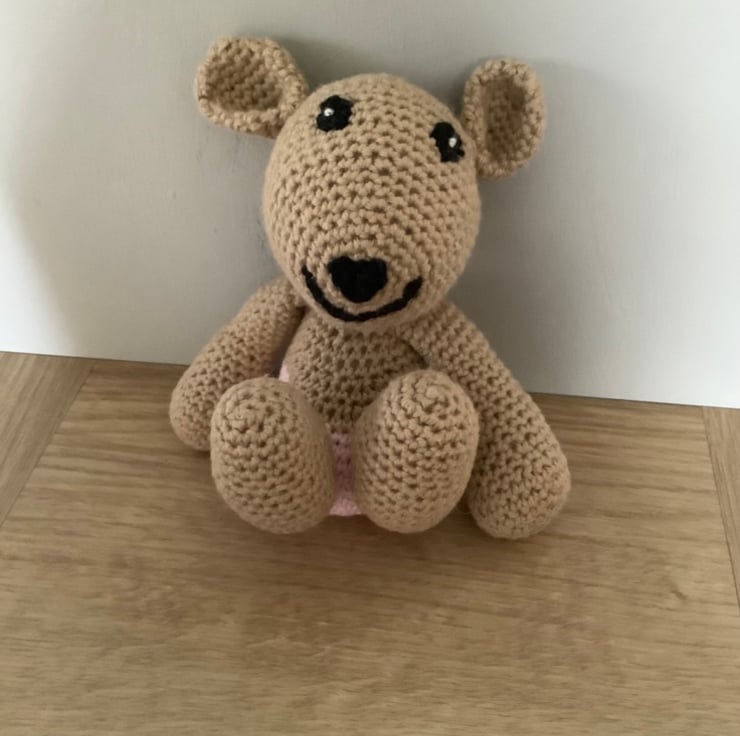 Scuttlepants is a mouse. She is a character in the book of the same title. This mouse is hand crocheted. She wears Pink pants and scarf and a happy smile. There are 9 brothers and sisters in the book and Scuttlepants is the main character. She is made from 100%cotton, with polyester filling.Tested to EN71 safety standards. She measures 18cm from top of ear to base of foot.