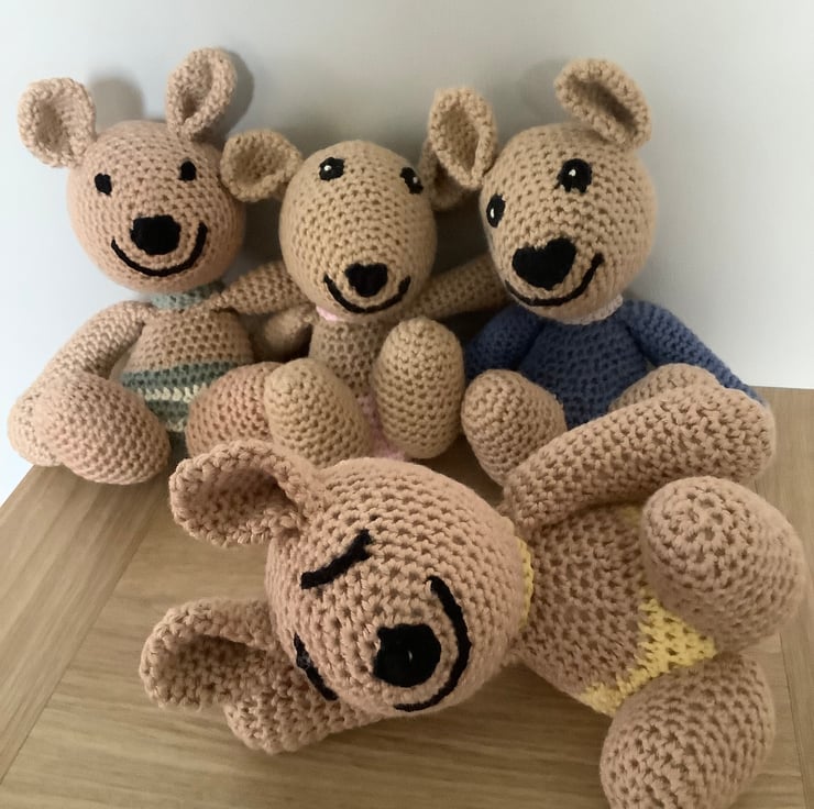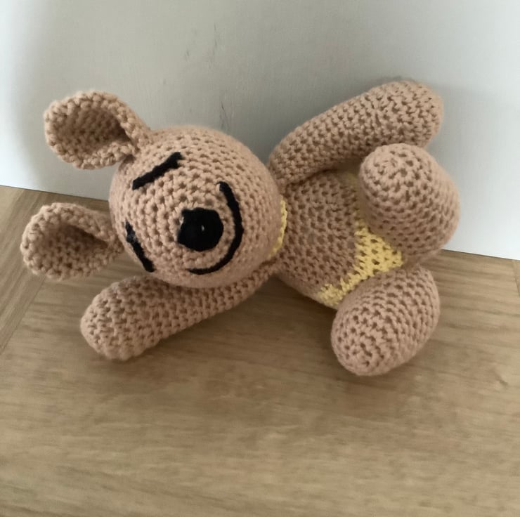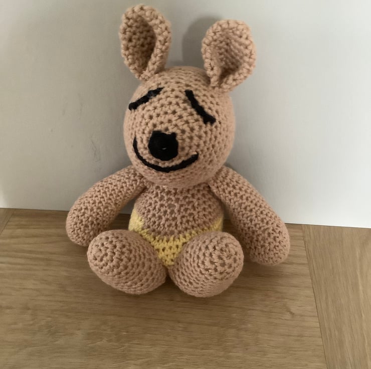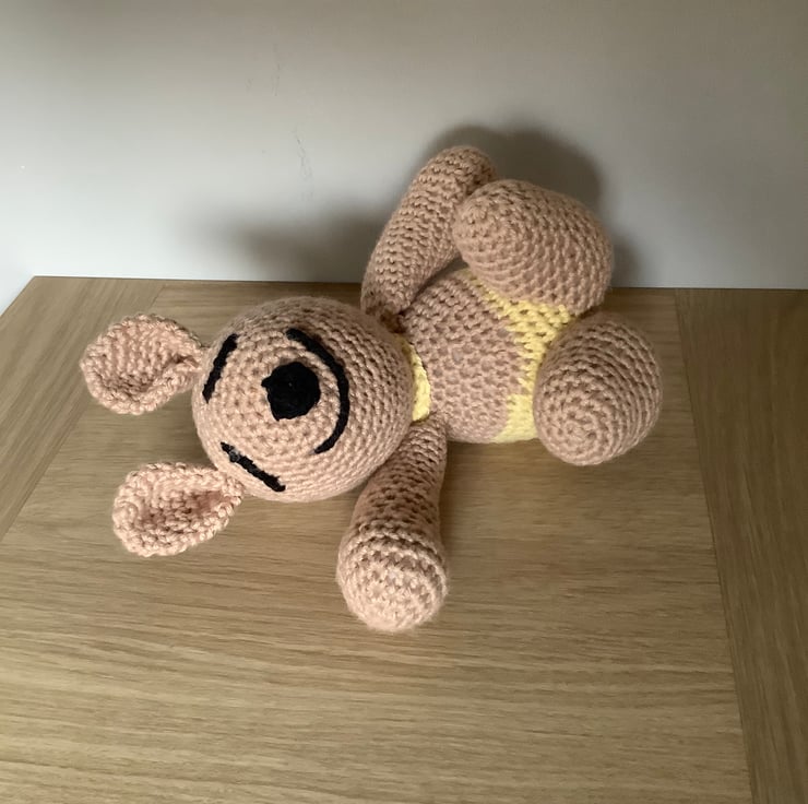 This Scuttlepants Character shows one of the sisters from the book Scuttlepants. She is a sleepy character shown snoozing in many of the books illustrations. She is Hand Crocheted in 100%cotton with polyester filling, made to EN71 safety standards. She measures 21cm in length and has ears that make a crinkly sound when touched. She has yellow shorts and scarf and a happy smiling face.