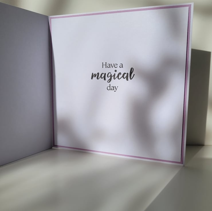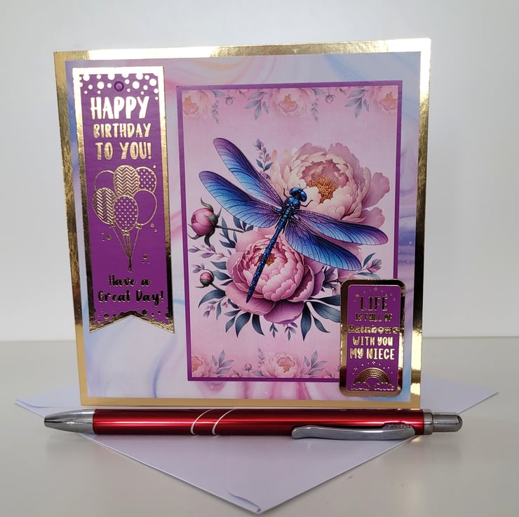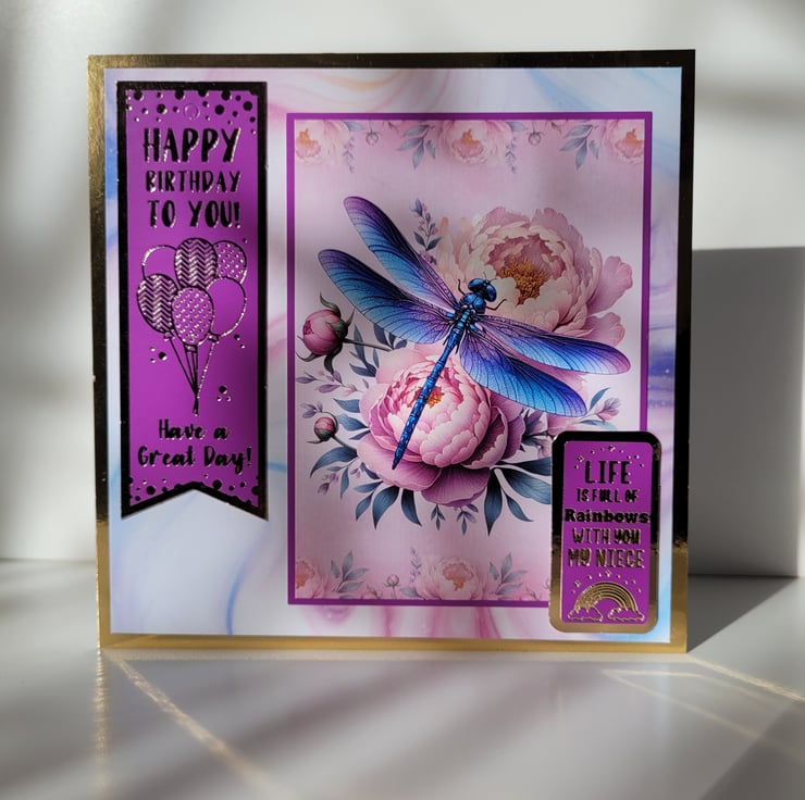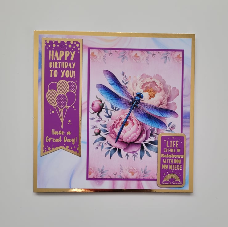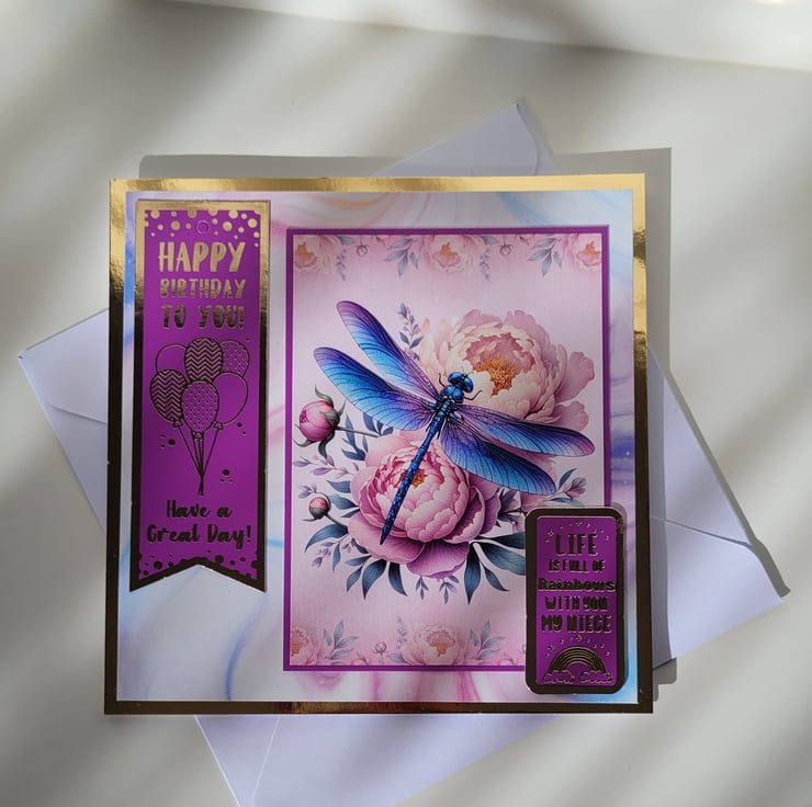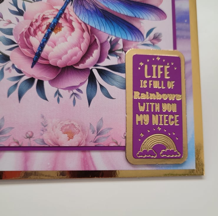 This card blends bright florals, a delicate dragonfly, and a sweet rainbow-themed sentiment — creating a keepsake your niece will treasure. The design feels both modern and magical, making it ideal for gifting alongside presents or sending by post.