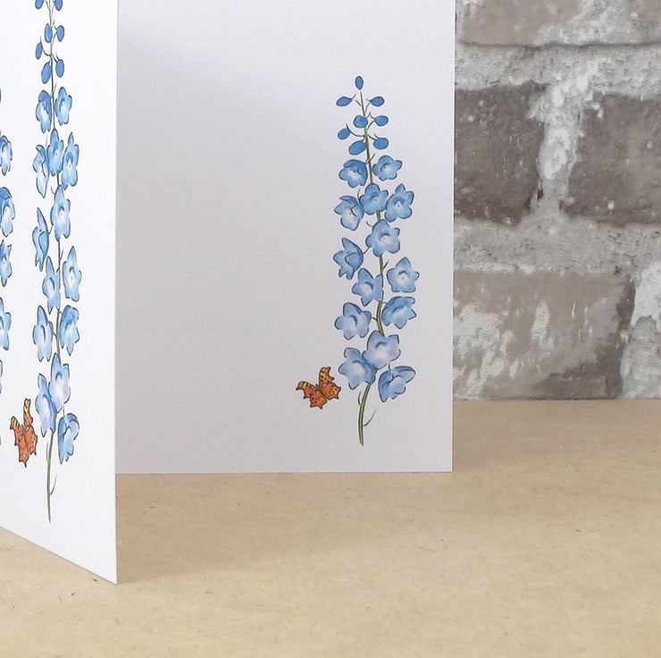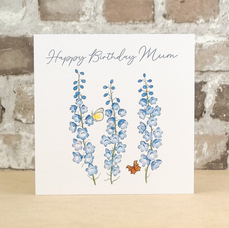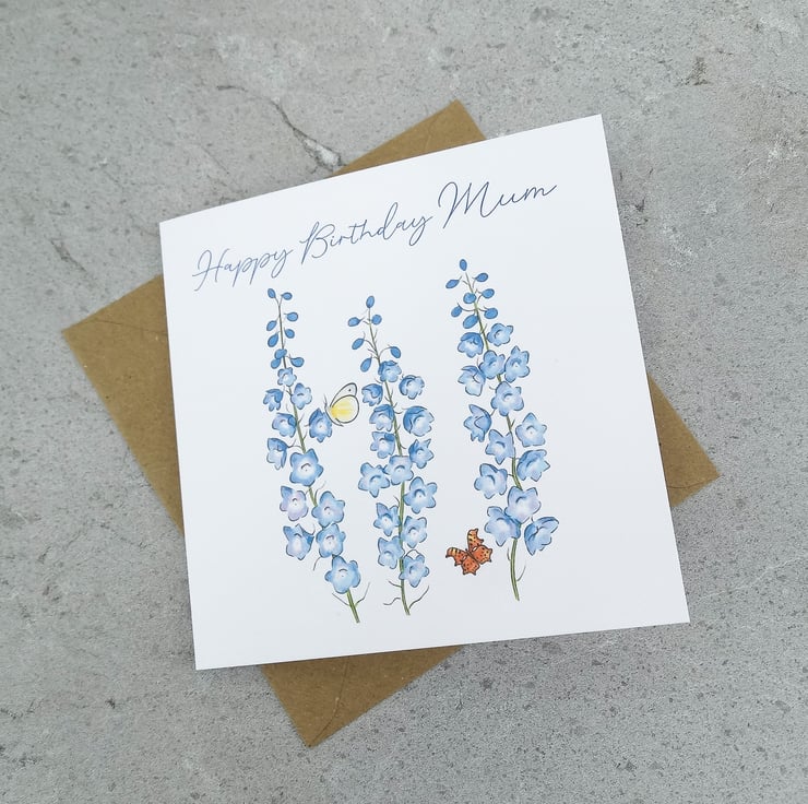 This Birthday Delphinium card for Mum has been printed with my original artwork on 'New' white matt texture FSC approved 280gsm card and comes with a brown kraft envelope protected in a clear biodegradable bag.