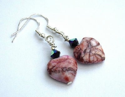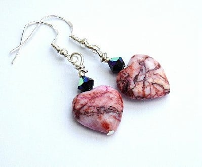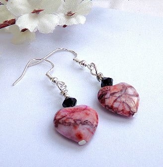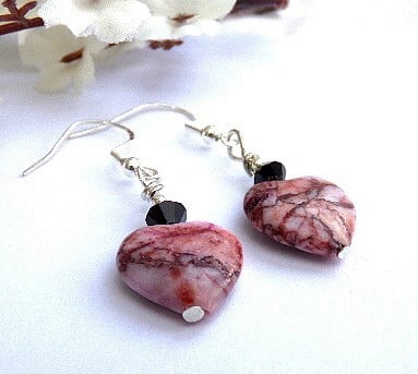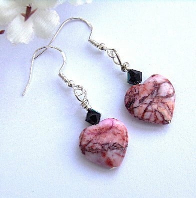 Beautiful semi-precious gemstone pink rhodochrosite hearts with natural veining and 5mm Precoisa crystal bicones in jet AB.
