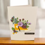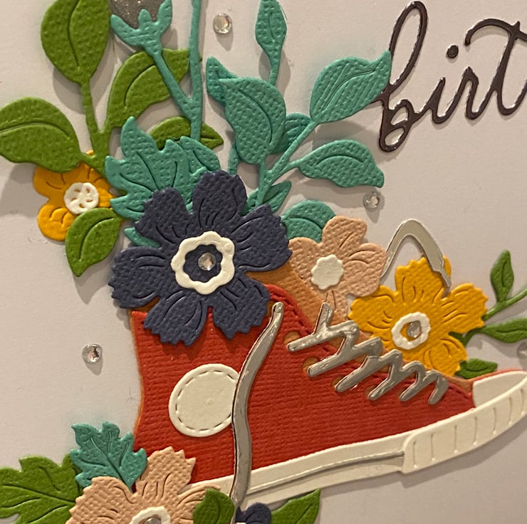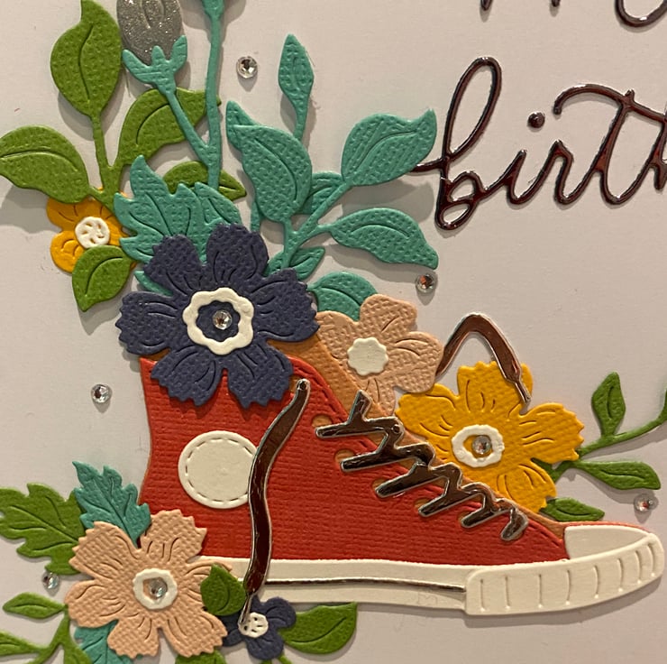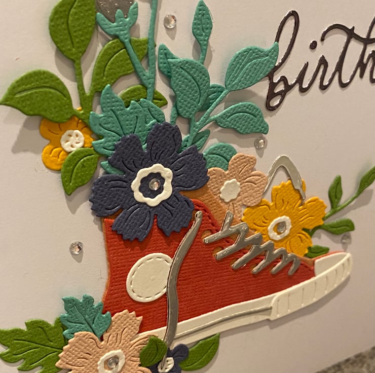 Bright, bold and full of personality this handmade birthday card brings together a classic trainer silhouette with a burst of colourful florals for a fun, modern twist. Layered paper details add gentle dimension, making the design feel fresh, uplifting and perfect for celebrating someone special.