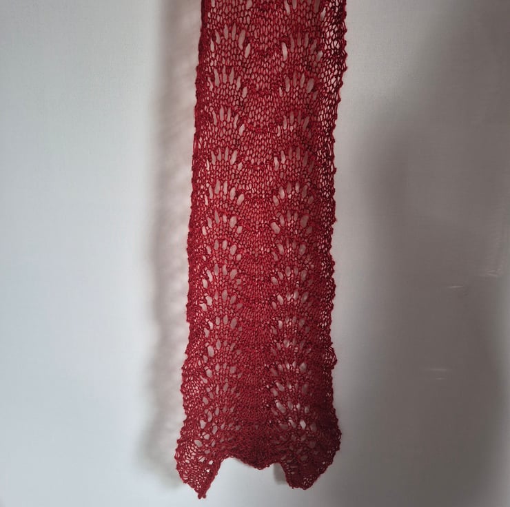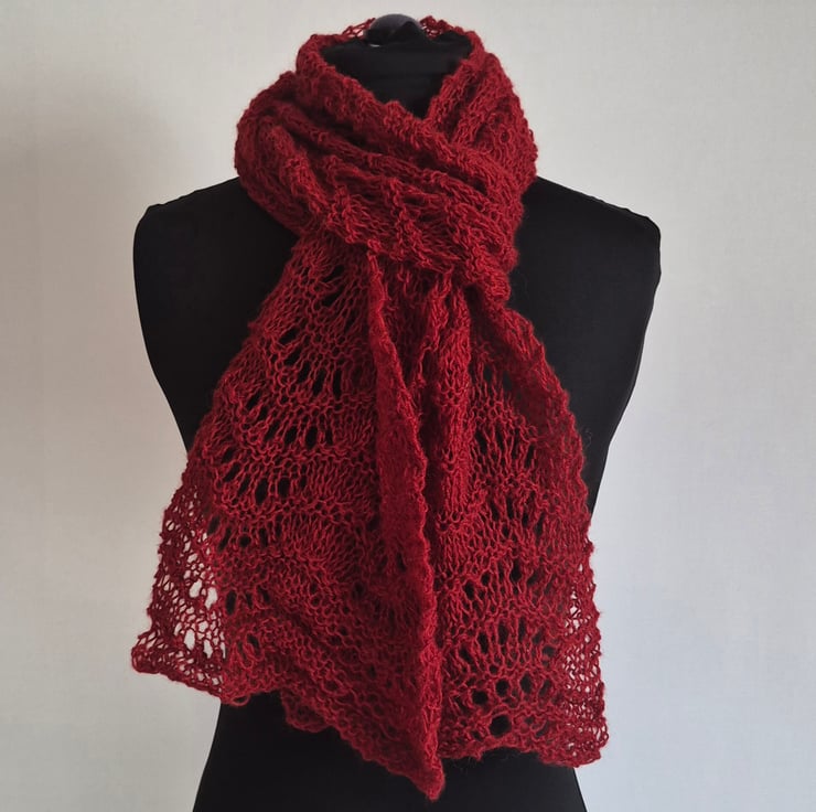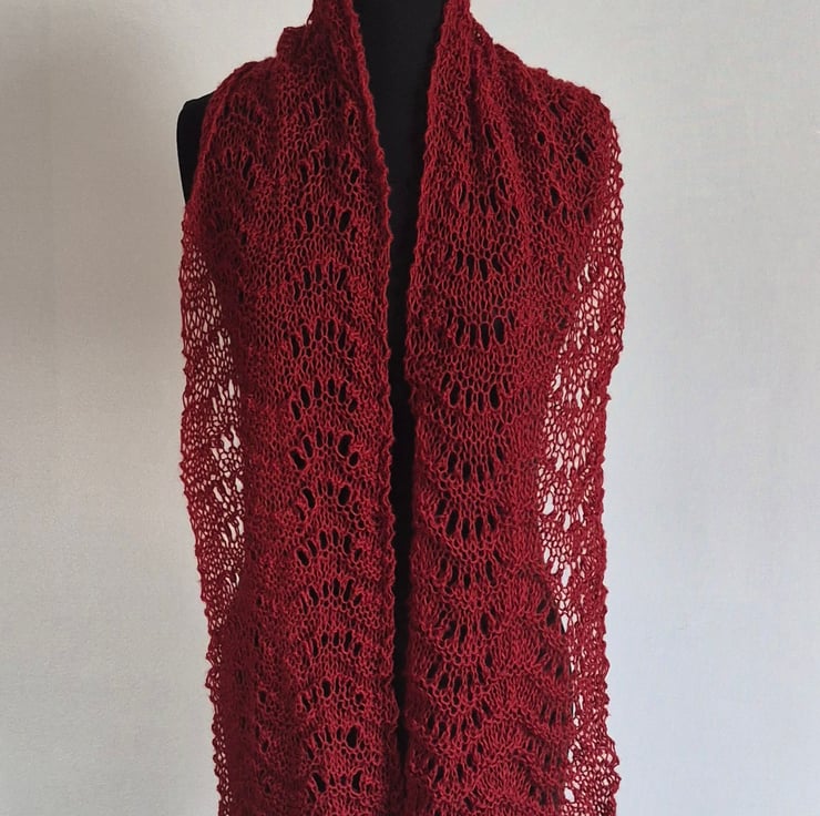 Handknitted Lace Scarf in a deep burgandy. Pretty lacy design which is very lightweight with an open knit. it has come from my stash and I cannot say much about yarn . Except that it is synthetic with a woolly feel and it was bought In Andorra while I was on a skiing holiday......