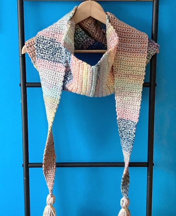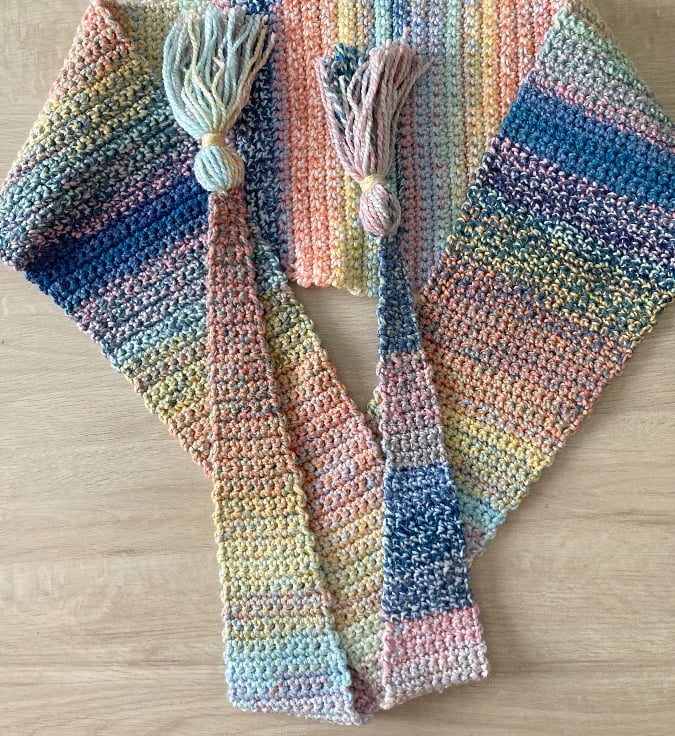 Have crocheted this gorgeous long shawl in an 100% Premium Acrylic Aran weight yarn……..in a cool mix of pastel shades………love a ball of yarn that has lots of colours in it.