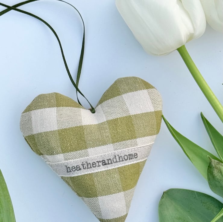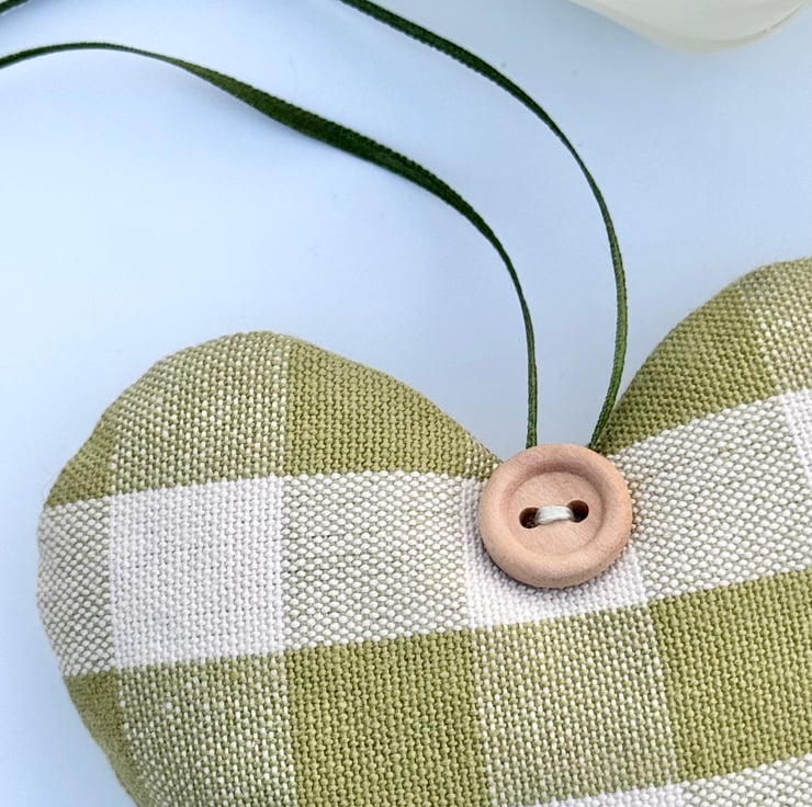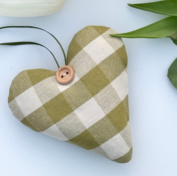 Fresh apple-green and soft white checks adorn the front and back of this handmade fabric heart decoration, bringing a lively new season vibe to your home decor.