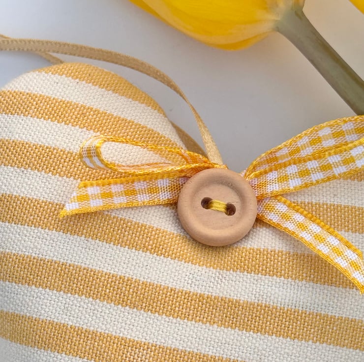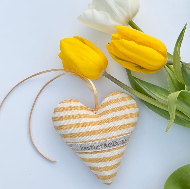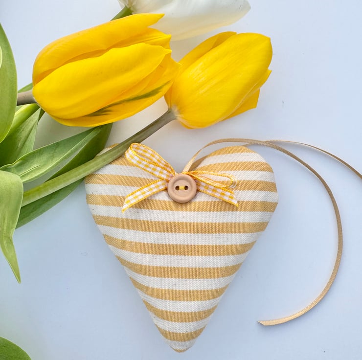 Soft saffron yellow stripes adorn the front and back of this handmade fabric heart decoration, bringing a cheerful sunshine hit to your home decor.