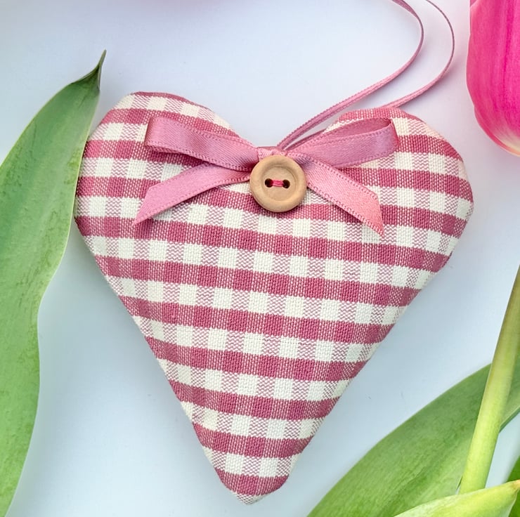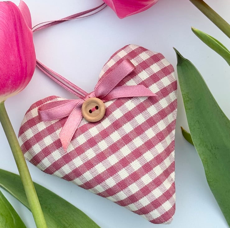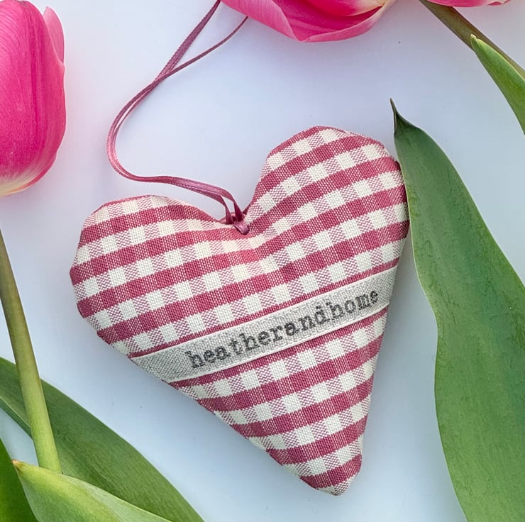 Gentle clover pink gingham checks adorn the front and back of this handmade fabric heart decoration, bringing a cosy new season vibe to your home decor.