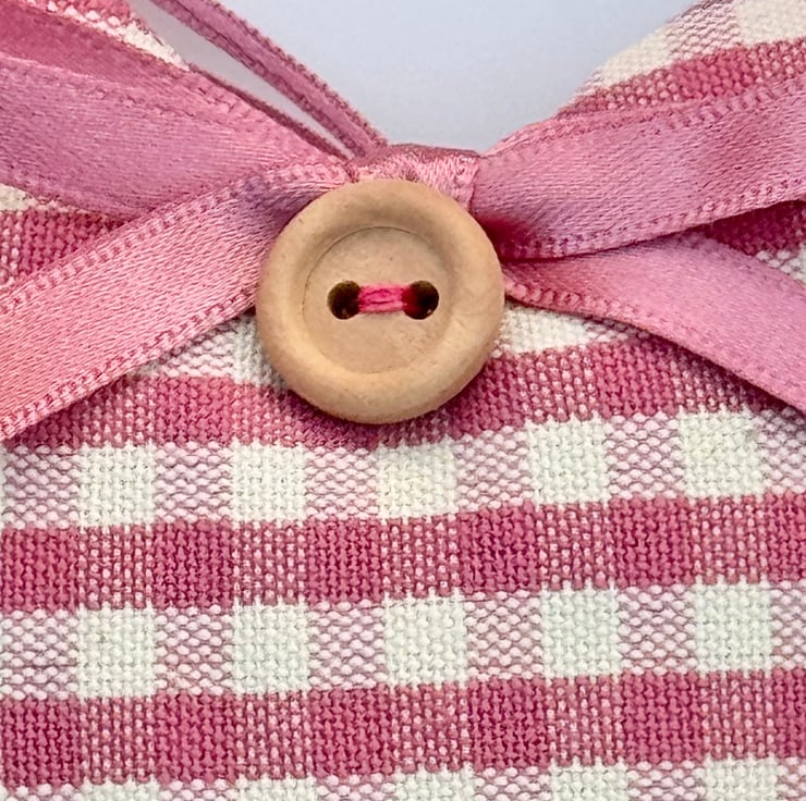 Made in a superior woven cotton fabric and filled with fragrant Hampshire lavender or with hypoallergenic wool toy stuffing, and finished with a round wooden button and dusty pink satin ribbon hanging ties and bow.