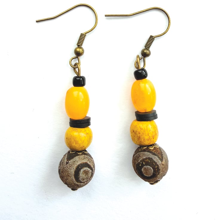 Yellow brown and black beaded boho style dangle drop earrings handmade using up-cycled and shop brought beads.