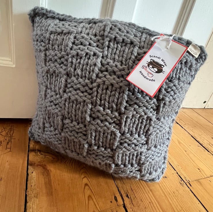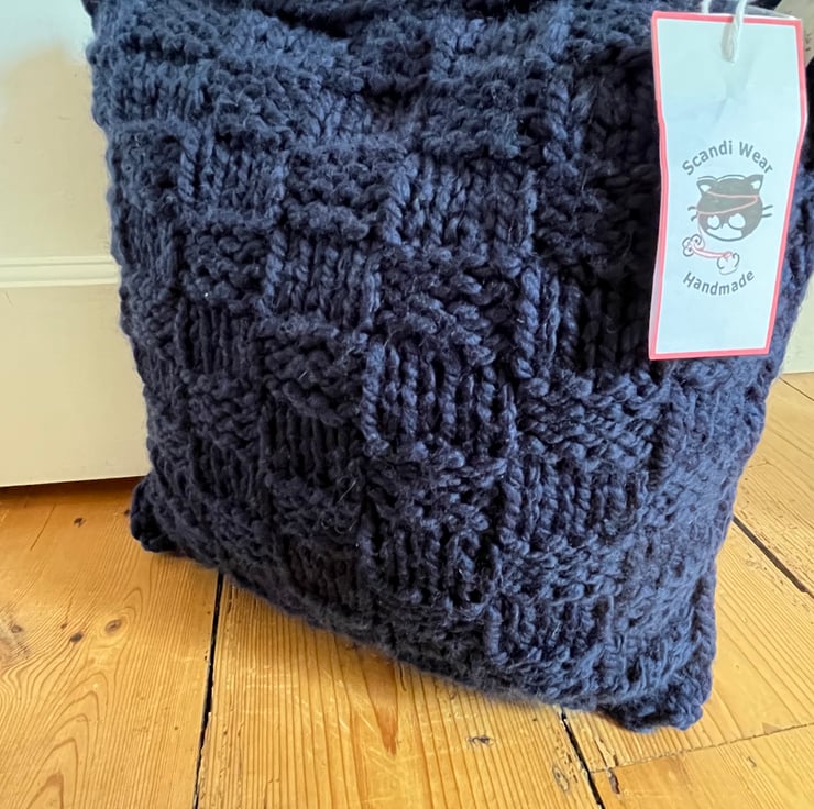 Hand knitted 35cm cushion in a stylish textured rectangular pattern. Perfect gift for anyone appreciating handmade, unique products. Offered in three different colours £20 each. Silver Grey, Navy Blue, or the two toned Dark Blue/Burgundy