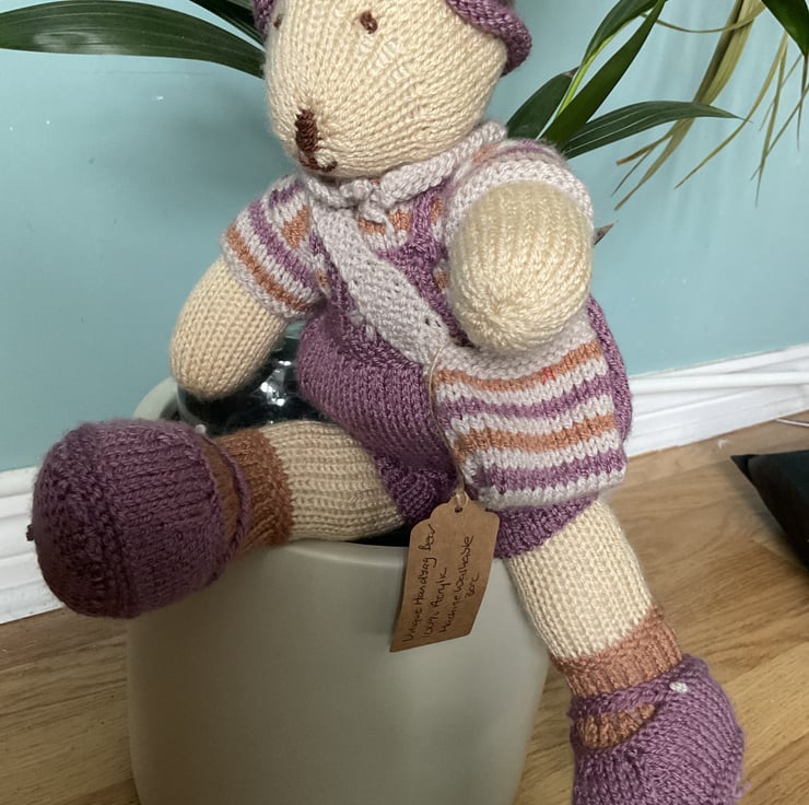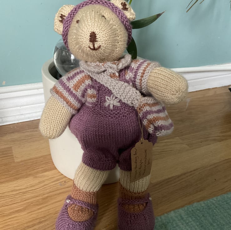 This sweet hand-knitted teddy bear has a gentle, old-fashioned charm.