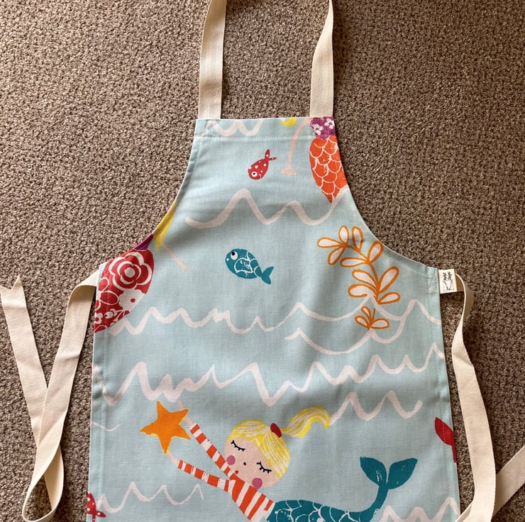 A small apron for a toddler or young child (possibly aged 2 - 6, we advise you use the measurements provided to check fit) in a variety of themed fabrics. Please note that, due to pattern placement, the apron you receive may not be exactly the same as the one shown.