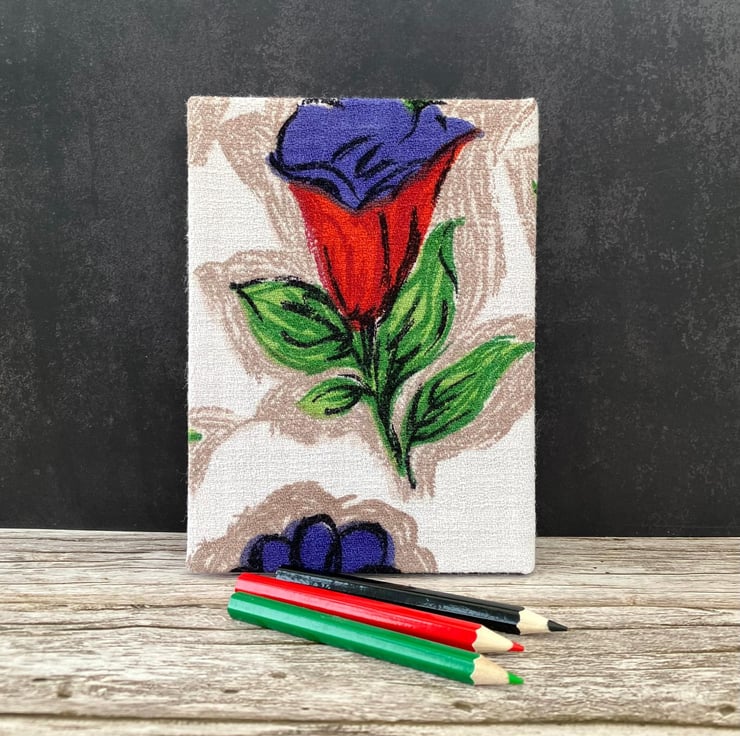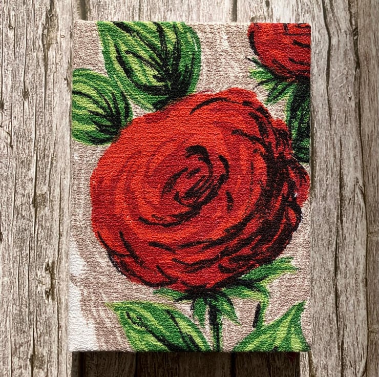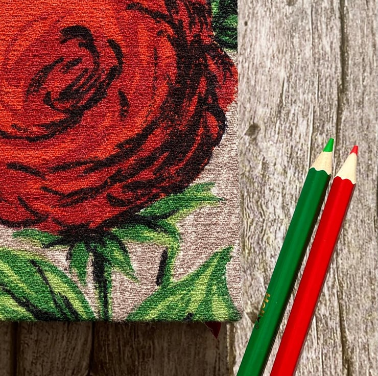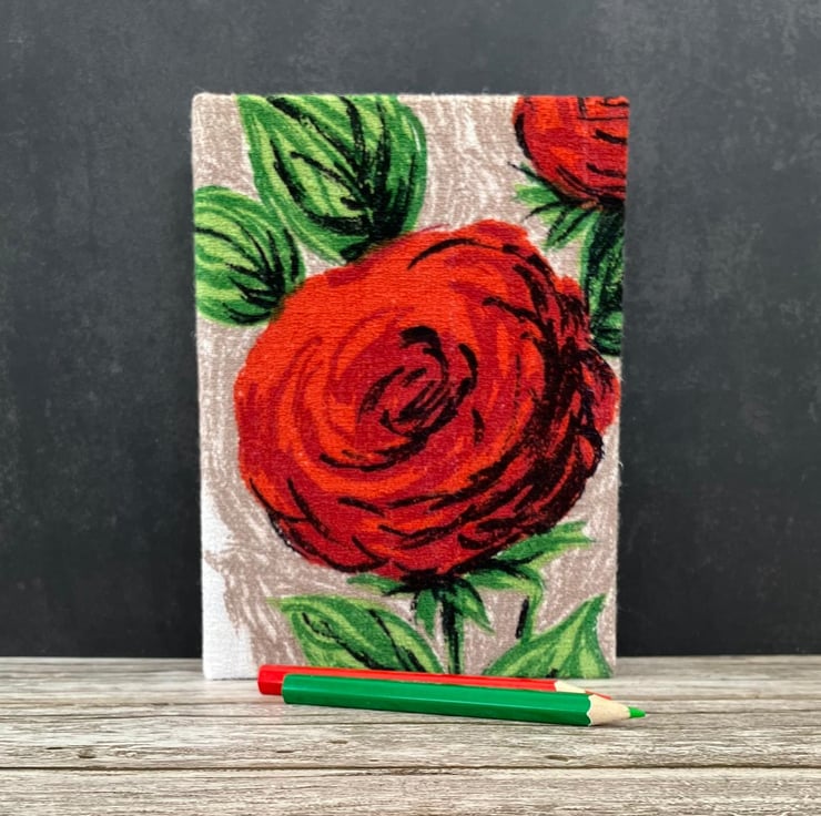 Handmade A6 Notebook, Sketchbook, 1950s Vintage Fabric, Red Roses, Purple Tulips
