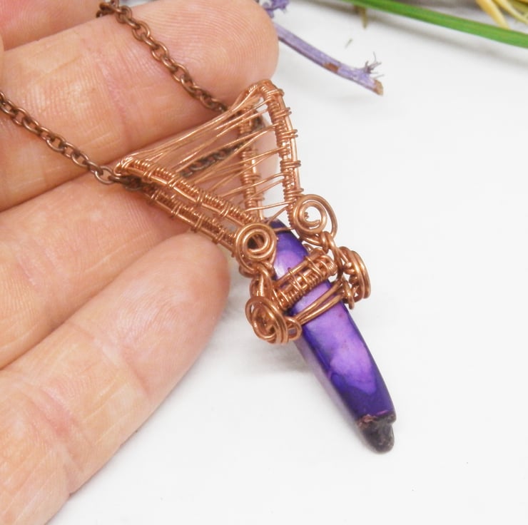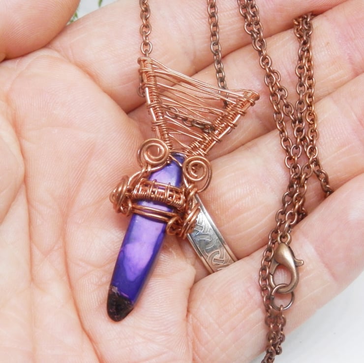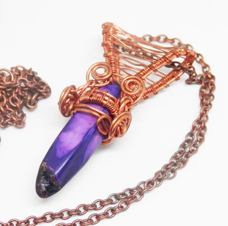 This is a stylish wire wrapped Necklace, made using copper wire that has been wrapped lovingly in a Celtic style around a piece of Purple Jasper in the shape of a Point. I have added swirls and a fancy bail.