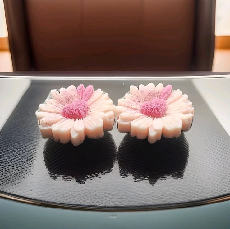 This product is a set of two handmade daisy flower soy wax melts in pink and white colours. Each melt is highly scented and designed to last more than 5 hours when used with a tea light as the power source. These modern-style melts are perfect for refreshing your home with a nature-inspired fragrance, making them ideal for themes such as summer