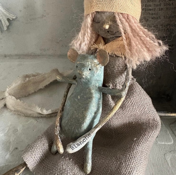 Blanche is a handmade paper mache and textile doll; she is made from tin foil, florist wire, masking tape, paper, and some cotton wool for definition; her hair is yarn, and she is wearing a french linen dress, hand-dyed muslin headscarf and neckerchief (her neckerchief is secured with a silver spacer bead), and is holding her favourite blue teddy bear.