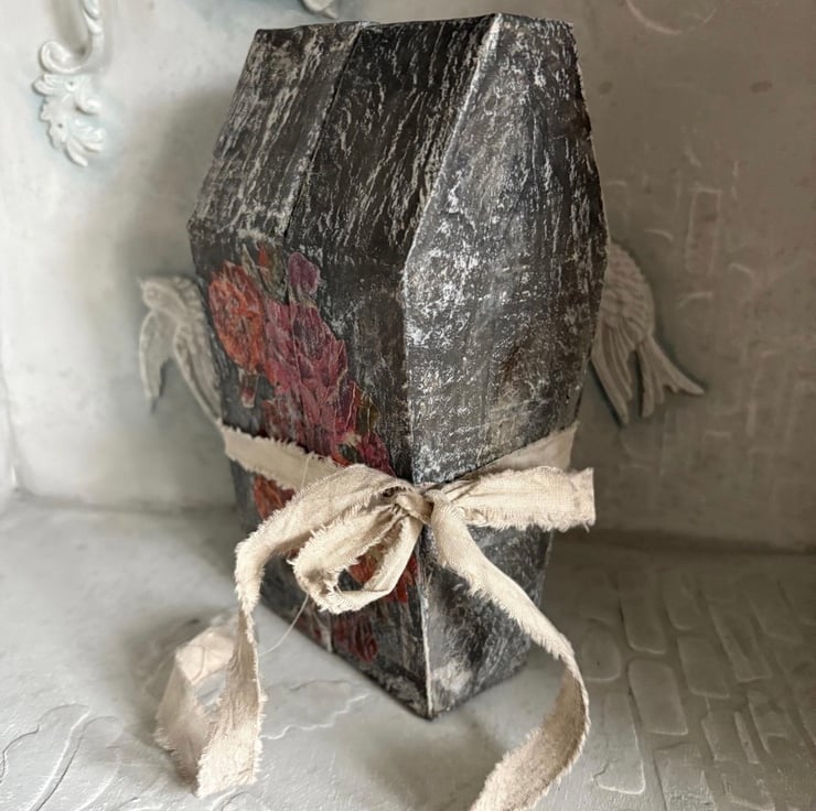 The coffin is made from scratch, and is finished as before; it is secured with hand painted calico hinges and ribbon tie.