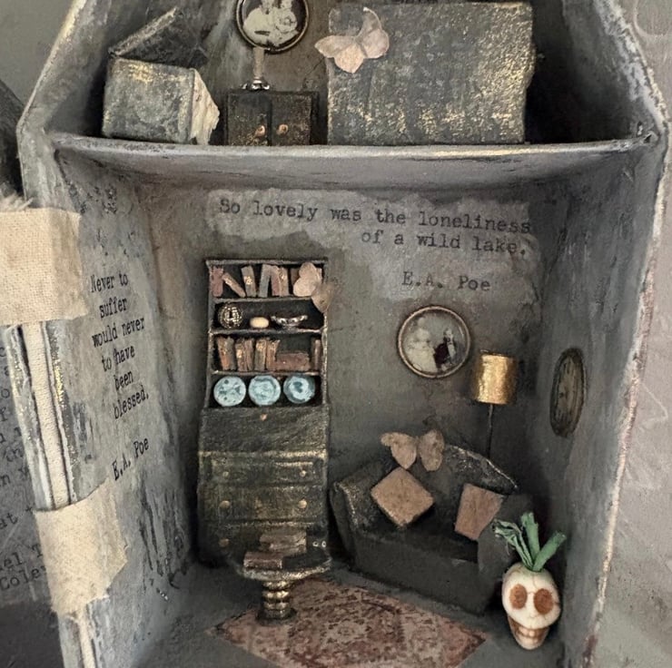 On the right of the coffin-shaped box is a tiny dolls house filled with dark and dingey paper furniture: