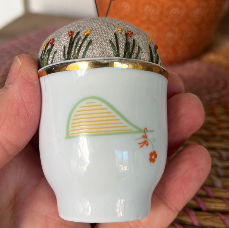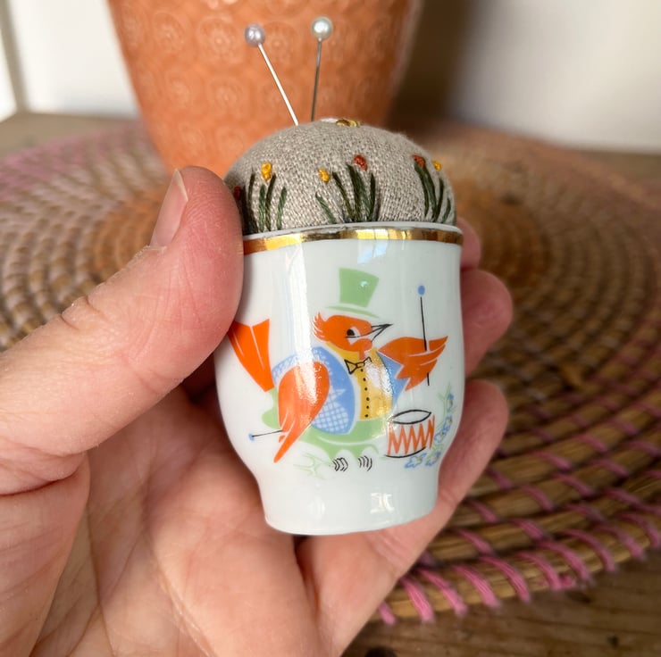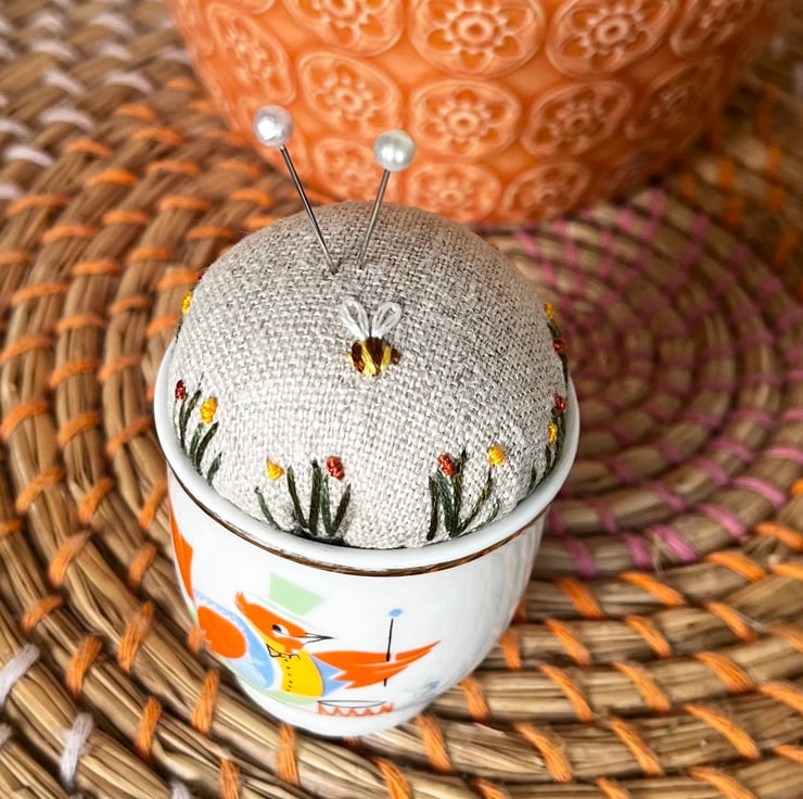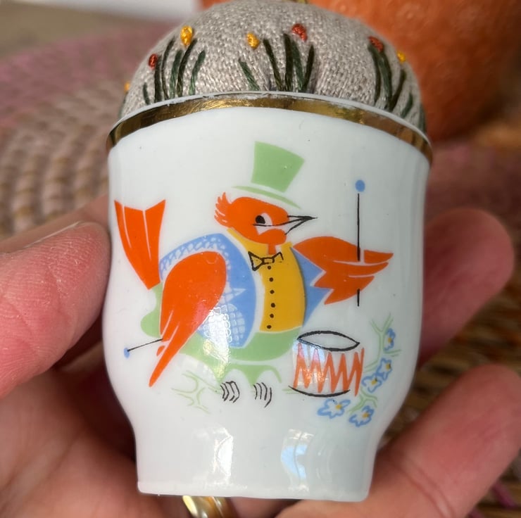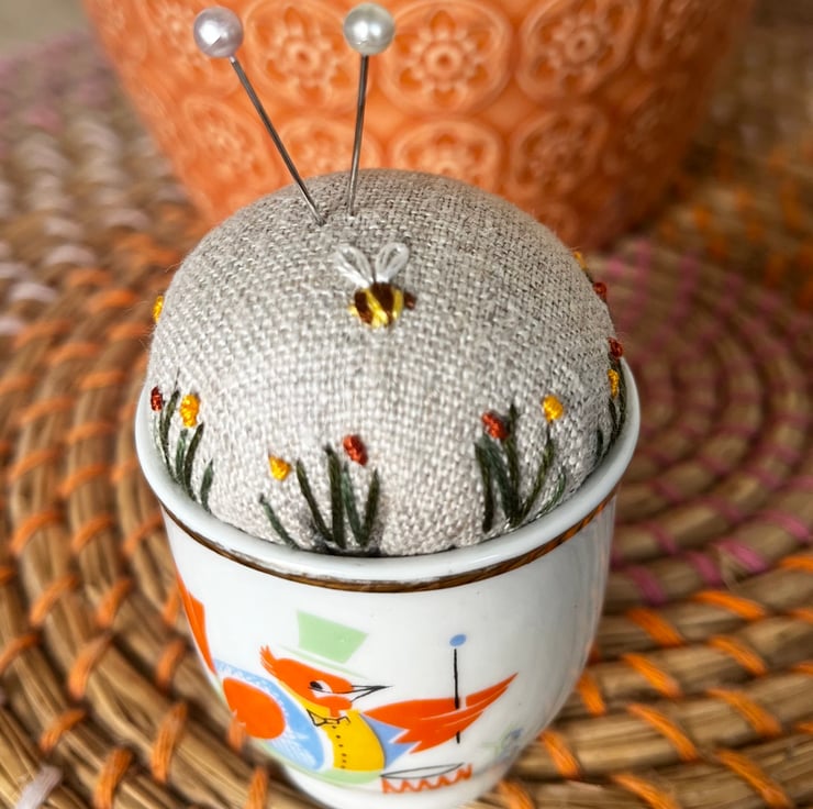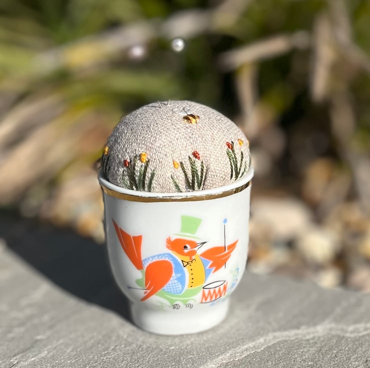 Cute embroidered pincushion in a vintage egg cup with a musical bird design. The reclaimed linen cushion has been embroidered with tiny flowers and a bee.