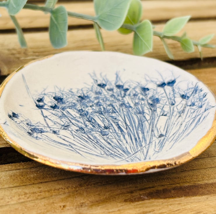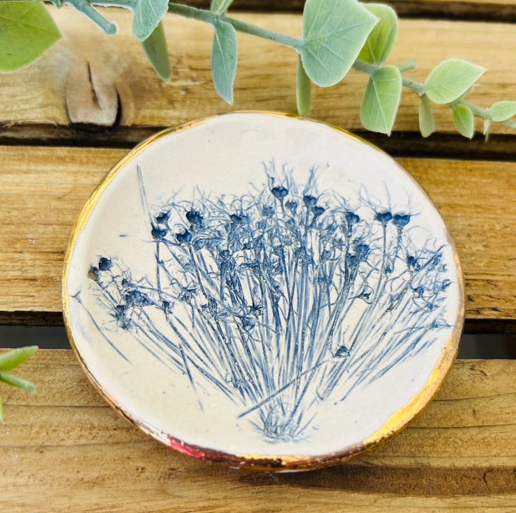 Little botanical dish made using plants and wild flowers from my garden. Perfect for jewellery, a small soap, trinkets or little treasures.