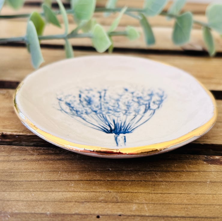 Each dish is individually pressed with plants so no two are ever the same. Some dishes have the addition of a little bee.