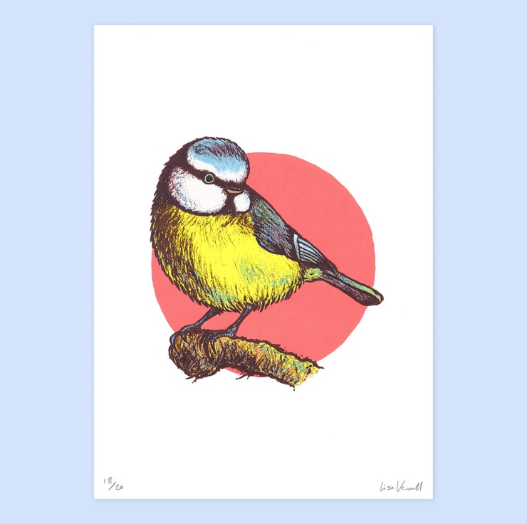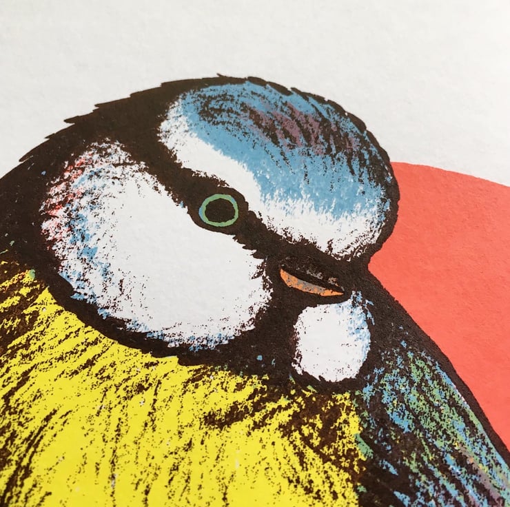 This Blue Tit print is from a series of 5 different Garden Birds that I created during the Spring of 2021. I wanted to capture the fluffy, roundness of this cute little guy, who I often see visiting my bird feeders.