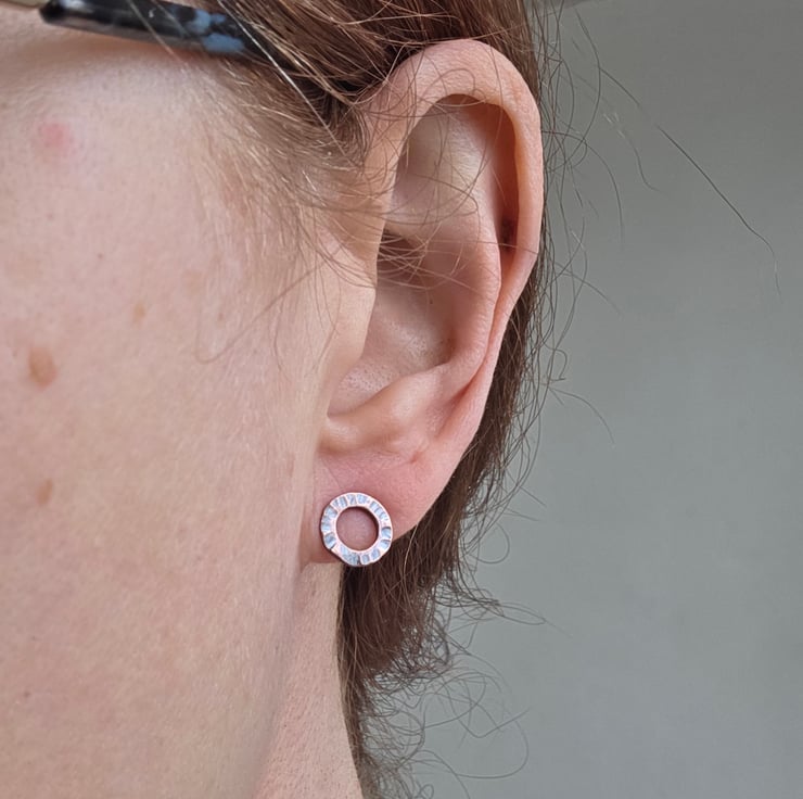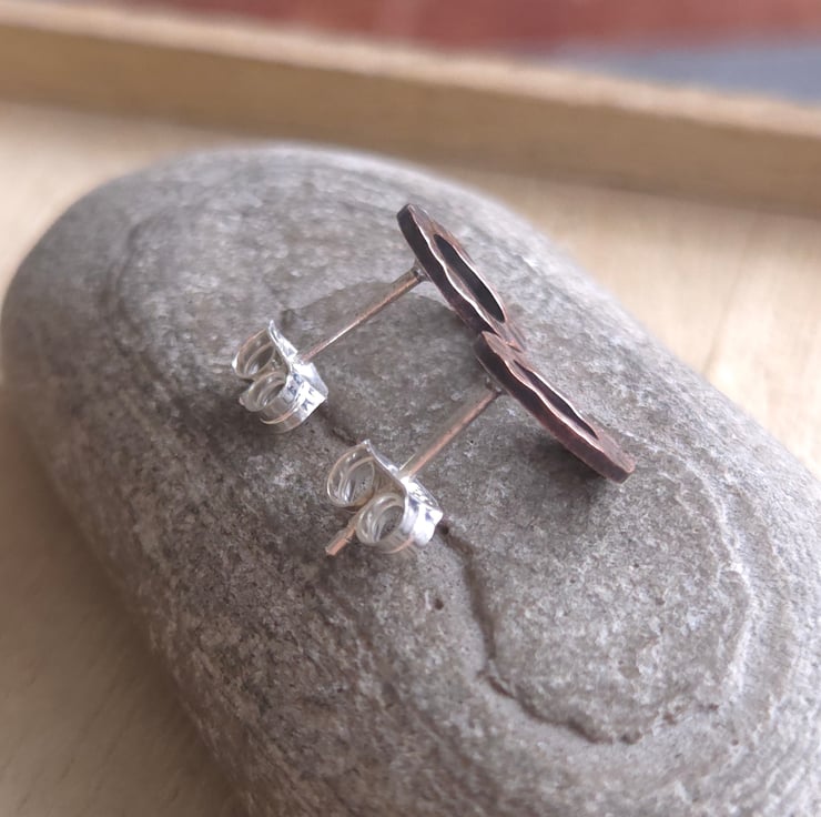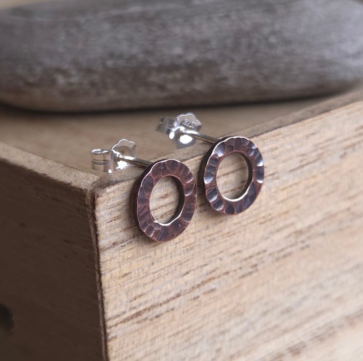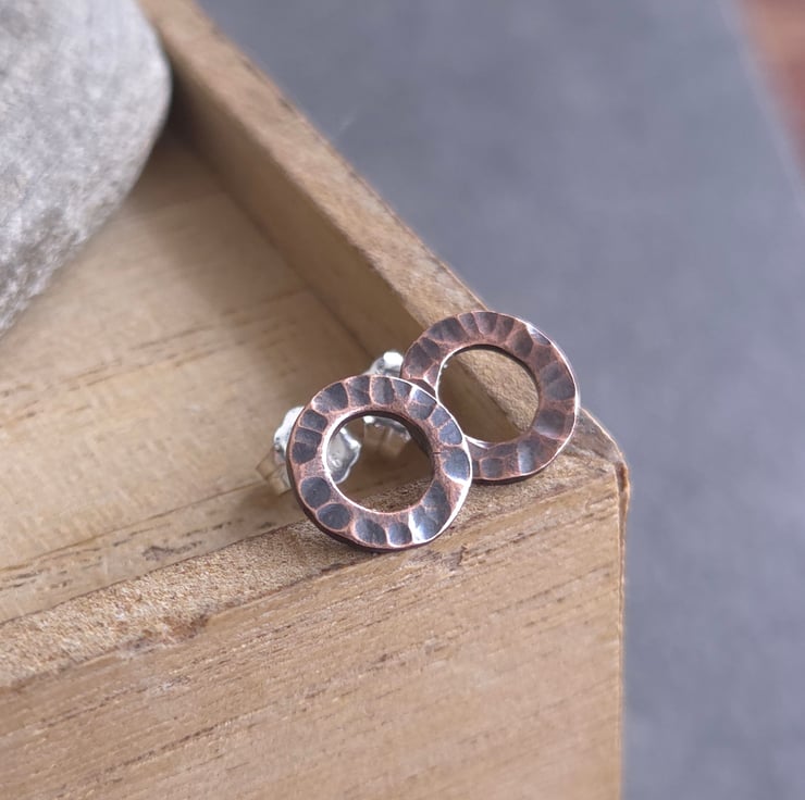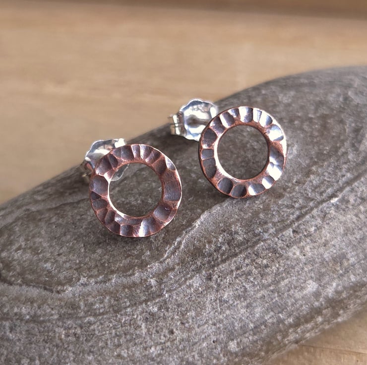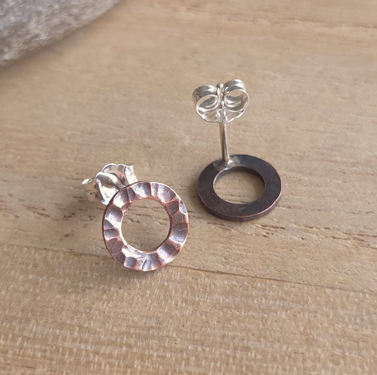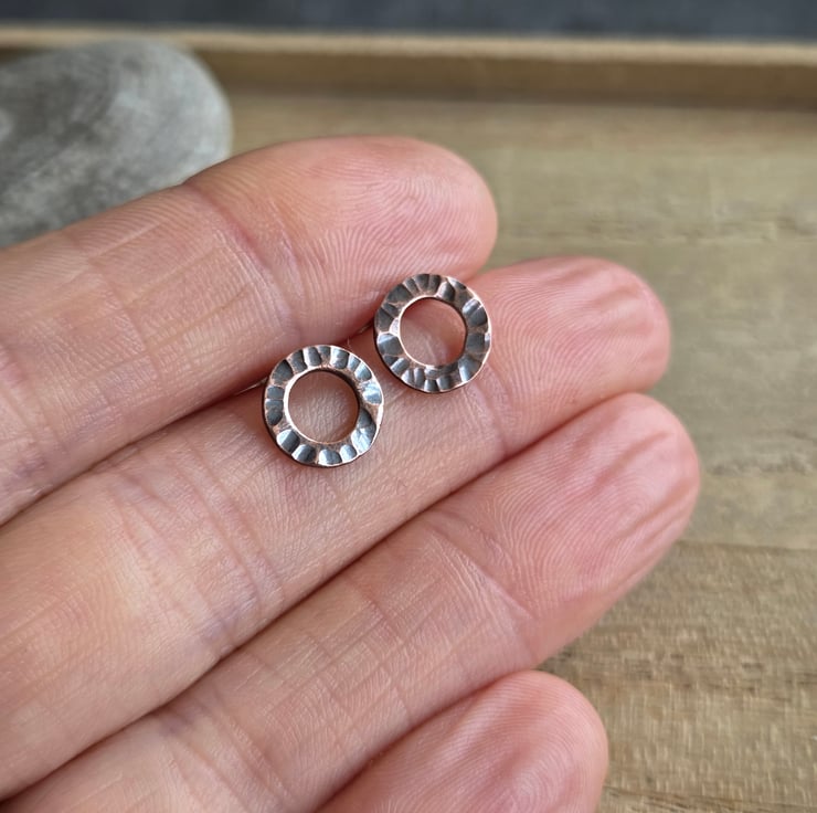 Little copper circle studs made from solid copper with a heavily hammer textured surface pattern. They have sterling silver ear posts and butterfly backs. An oxidised and polished finish gives them a lovely shine and highlights the pattern.