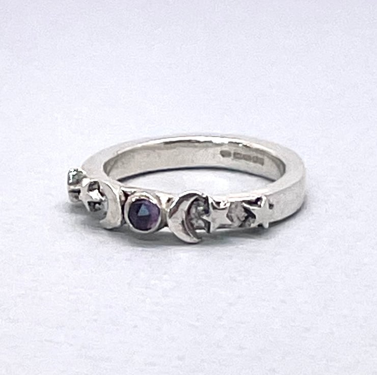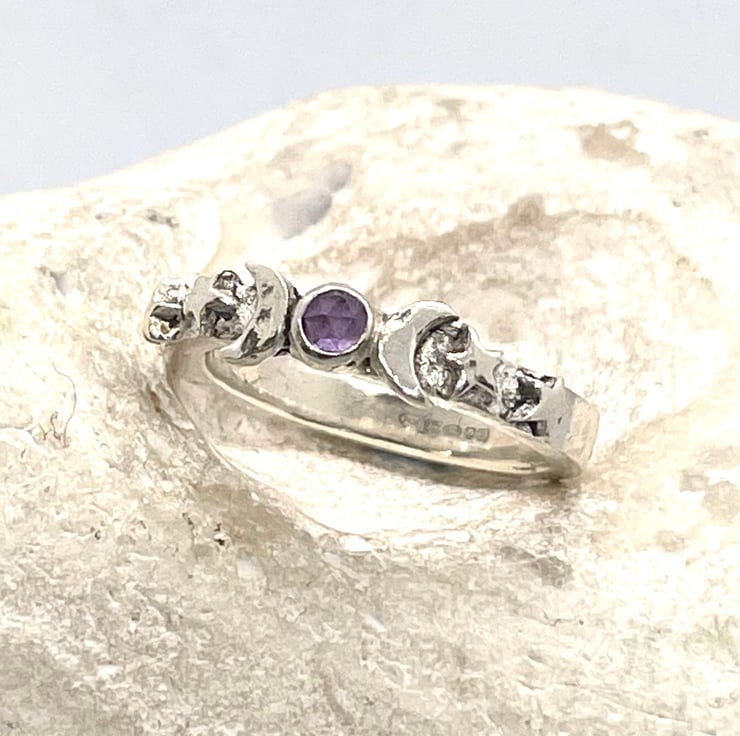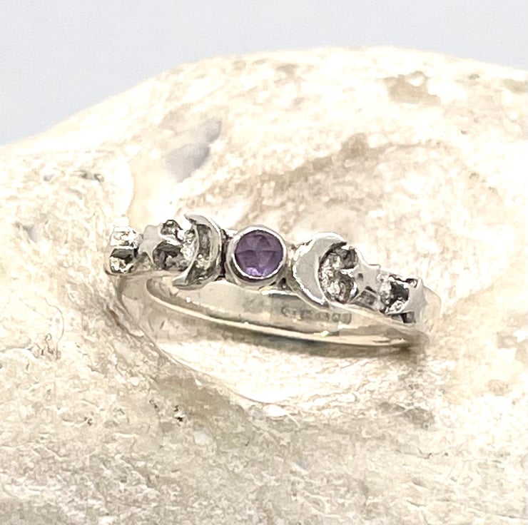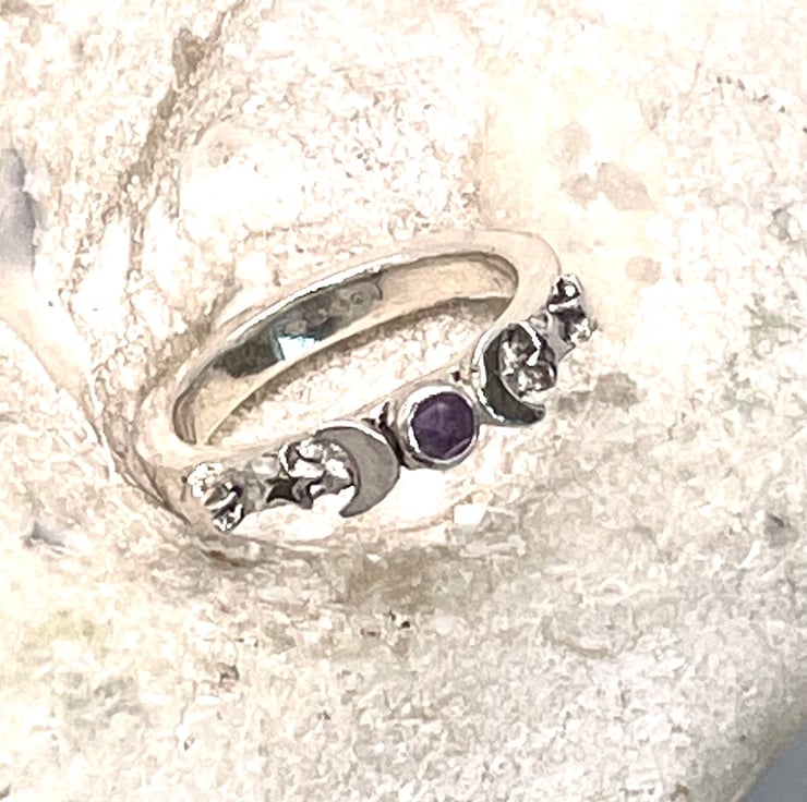 This beautiful chunky ring was hand crafted from fine silver clay. Featuring a rose cut 3 mm amethyst gemstone with moon and stars.