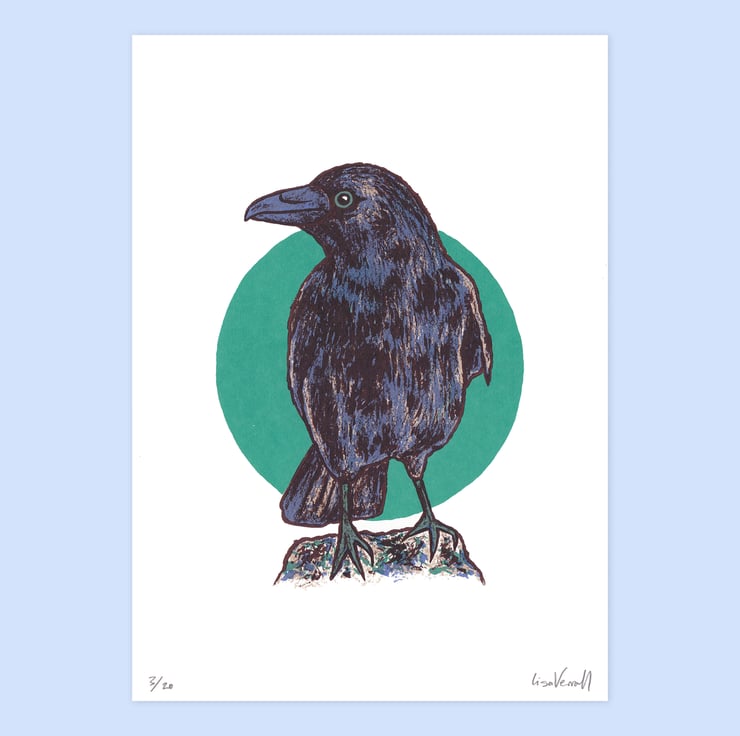 This Crow print is from a series of 5 different Garden Birds that I created during the Spring of 2021. This is a serious bird, about to embark on some serious screeching.