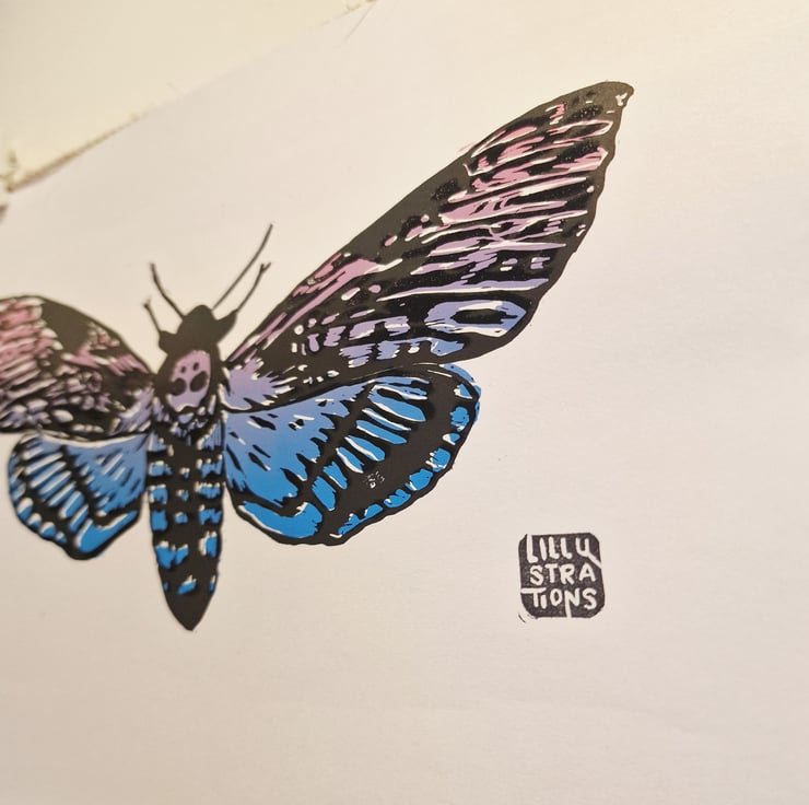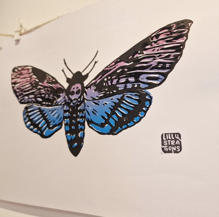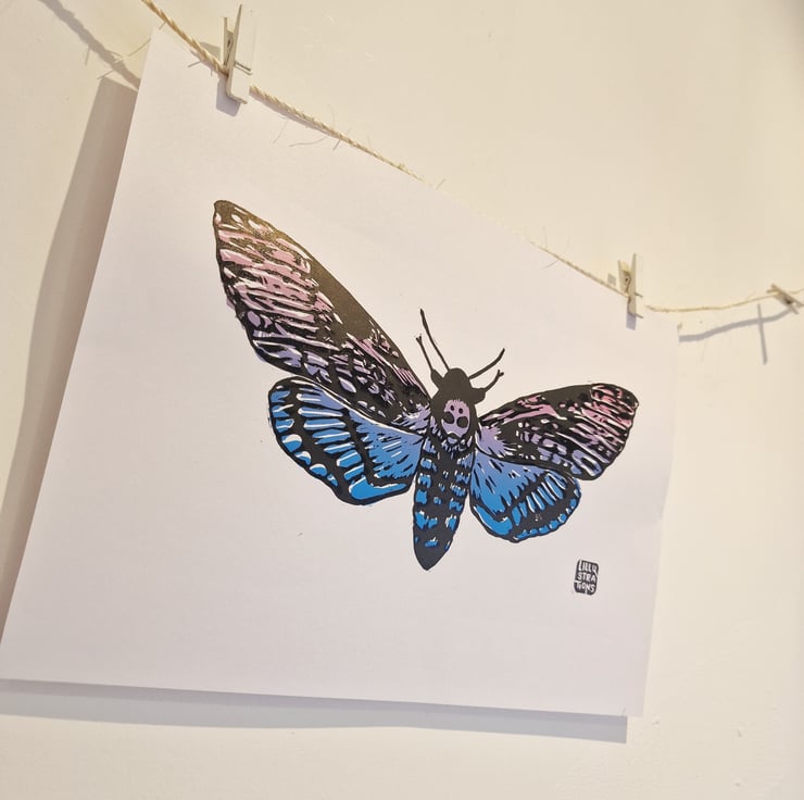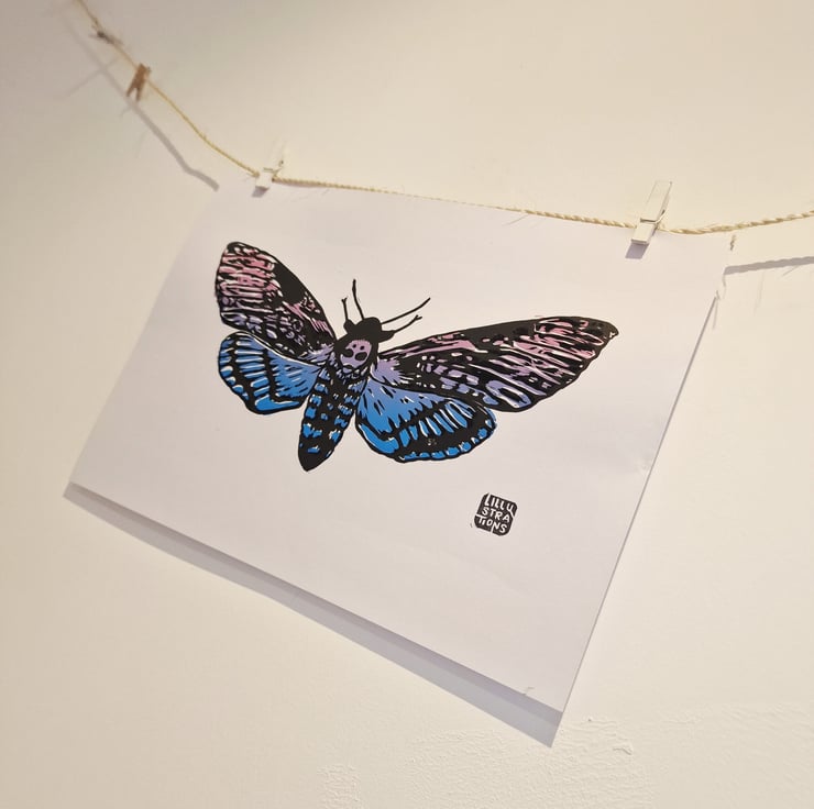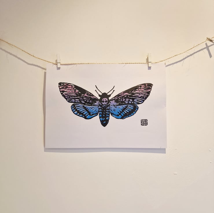 This original 2 layer Death Moth lino print was dreamed up, carved, and hand-pressed by me in Cheshire.