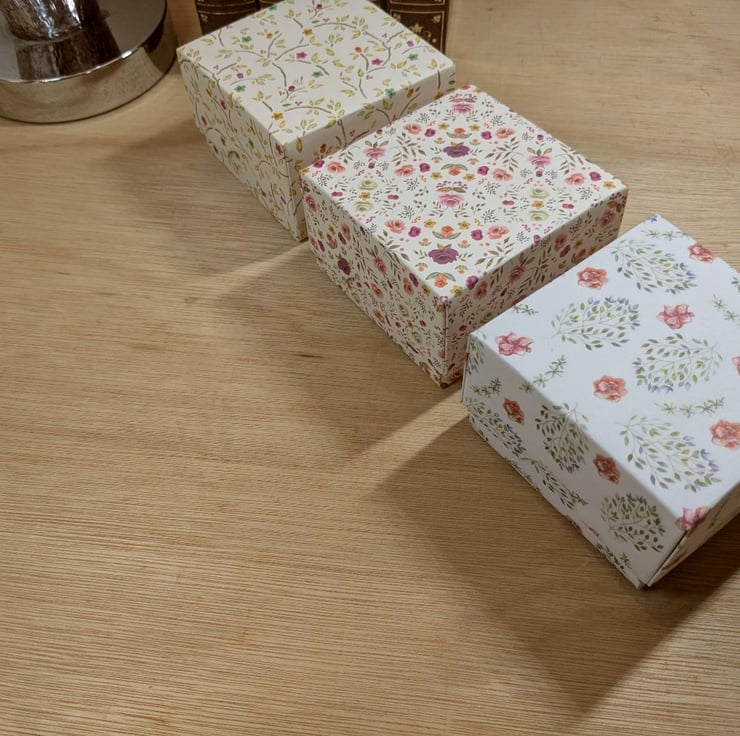 A set of three, handmade, small gift or presentation boxes with separate lids, each lid raised to provide a slightly deeper box. These are handmade boxes, not machine produced. Each box is handmade from top quality craft paper featuring small flowers on a predominanly white background over a thicker strengthening card. Small wooden spaces are used inside the lid to create a deeper box. The paper completely covers both the box and lid with no cardboard showing.Each box is approximately 7cm square by 4.7cm high.