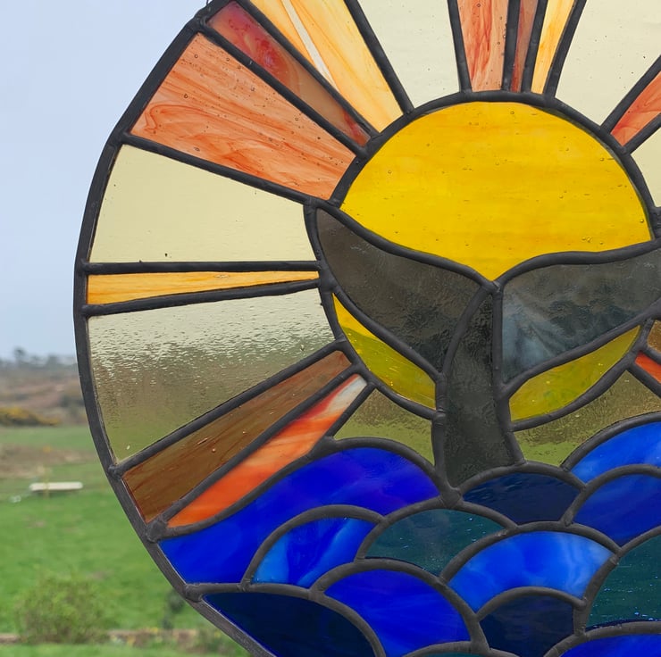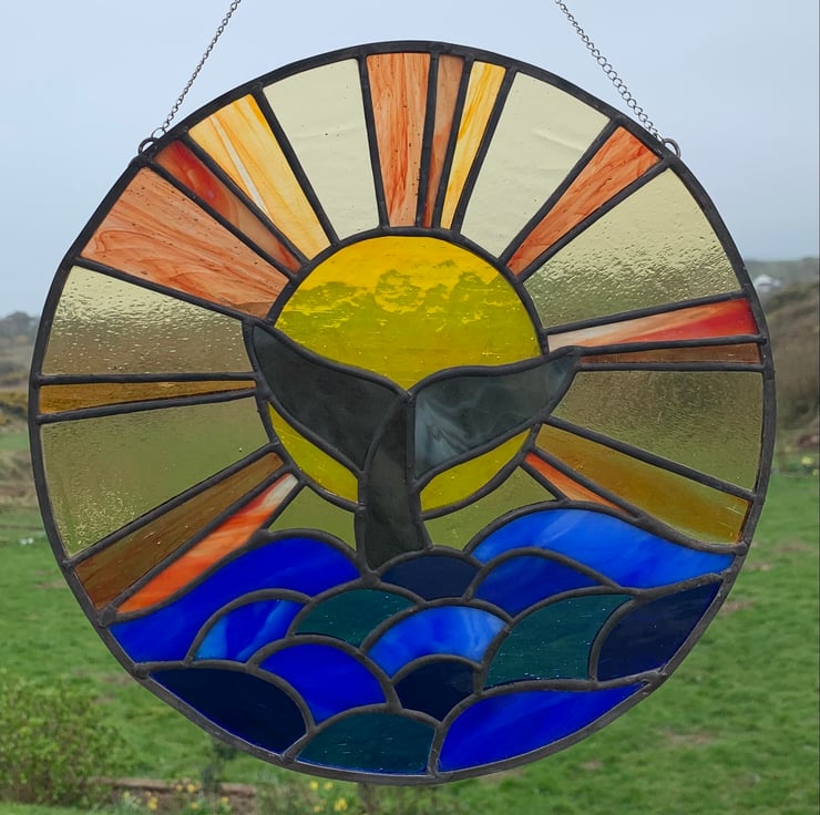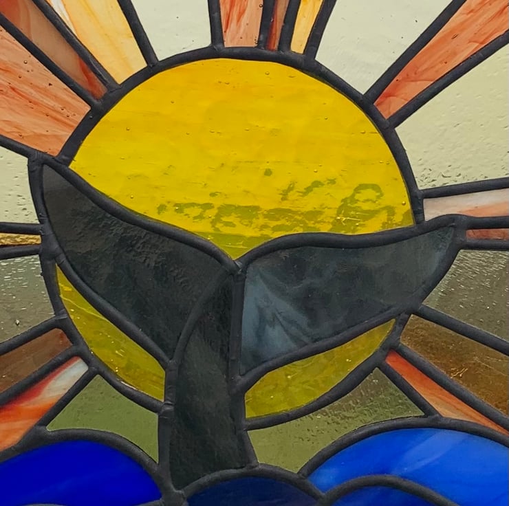 Stained glass sun catcher of a Humpback Whale diving against the setting sun.