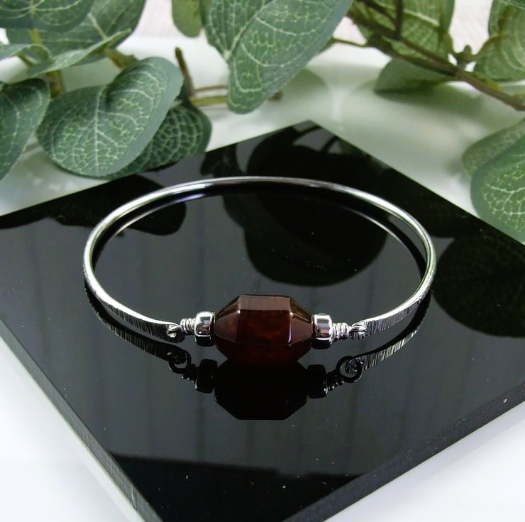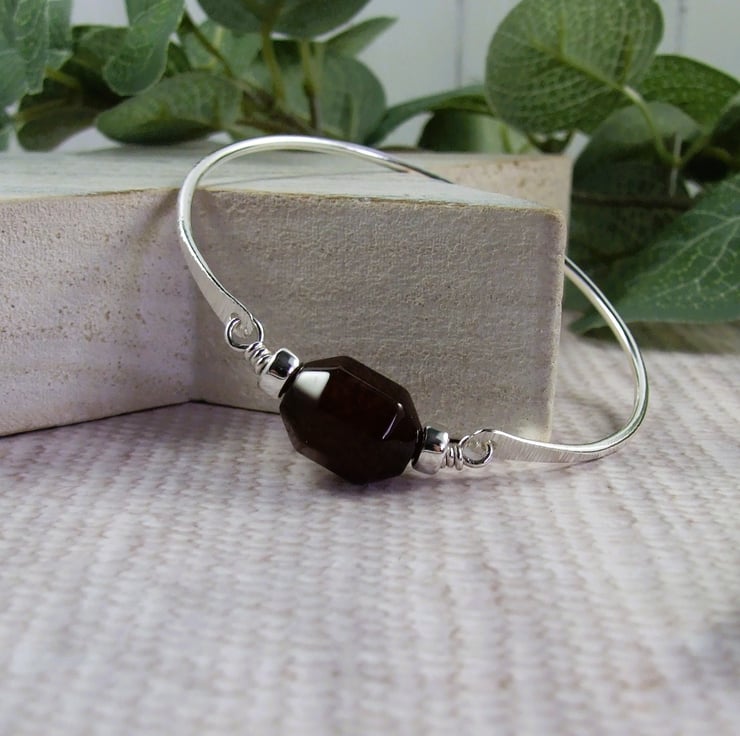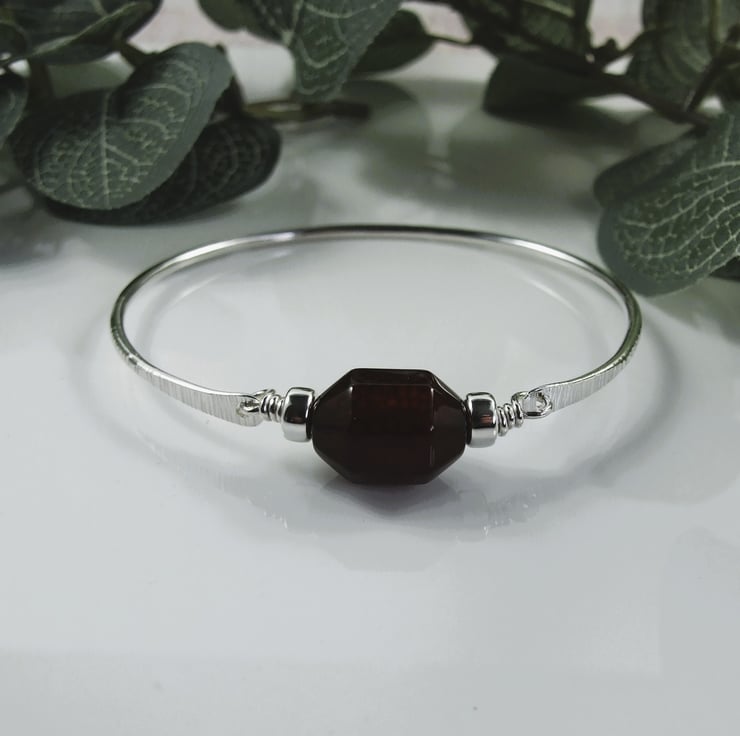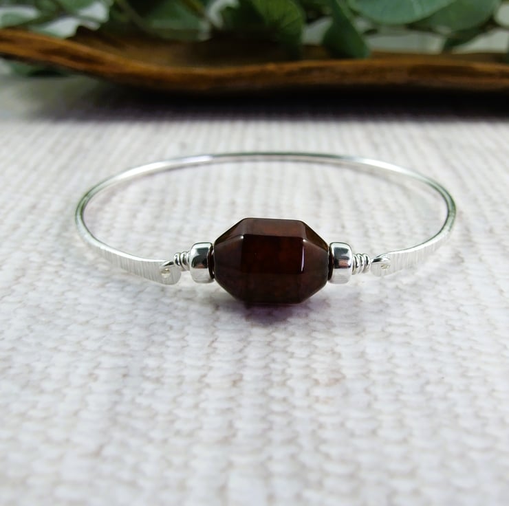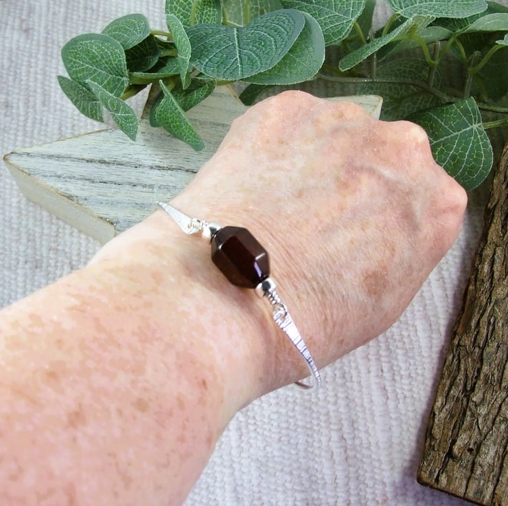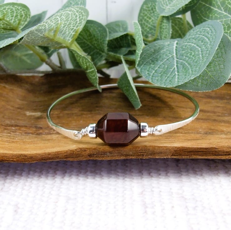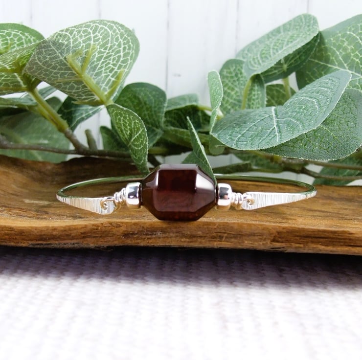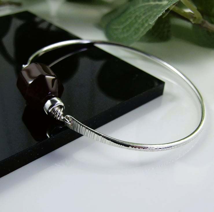 The bracelet is made from 2mm solid sterling silver wire which I have hand cut, slightly flattened on the ends and shaped and drilled and textured with a hammer. The bangle ends are securely joined together with a large plum coloured crackle agate faceted bead along with smaller silver beads. Securely wire wrapped in place with silver wire.