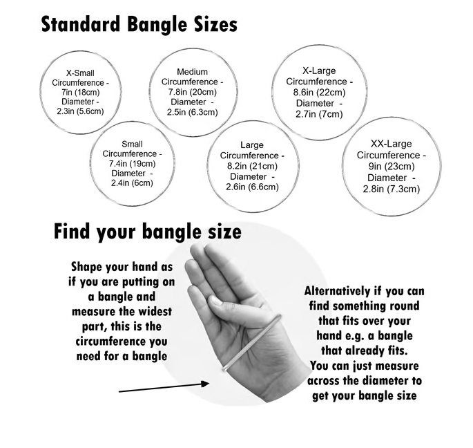 Bangle measures 20cm (7.8 inch) circumference to fit ladies size medium.