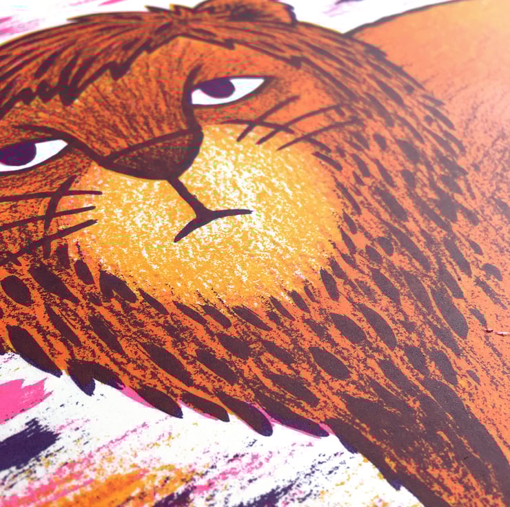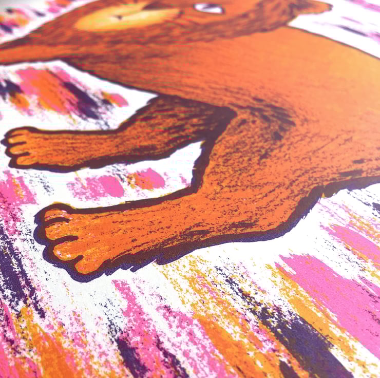 Three-colour screen print using water-based inks on 300gsm Canaletto Bianco paper.