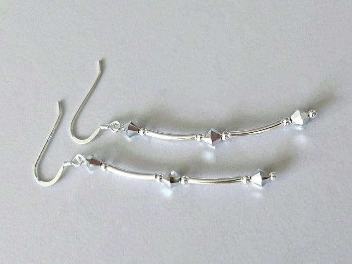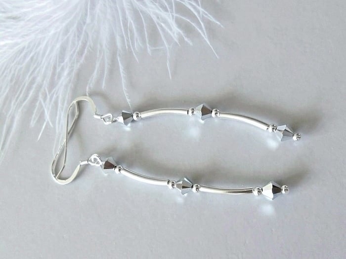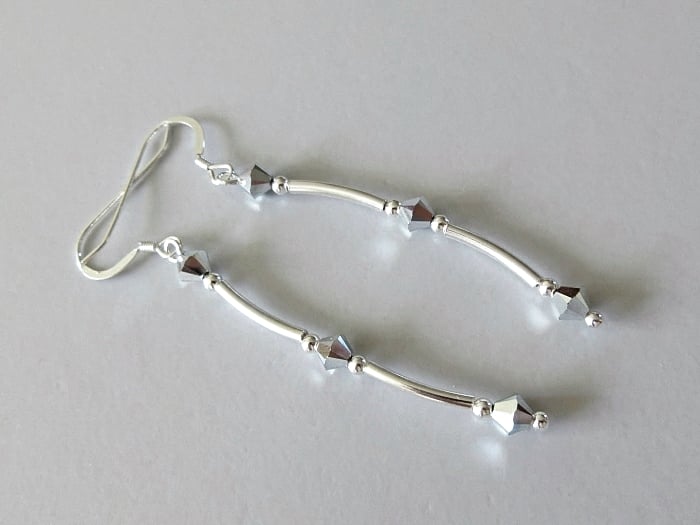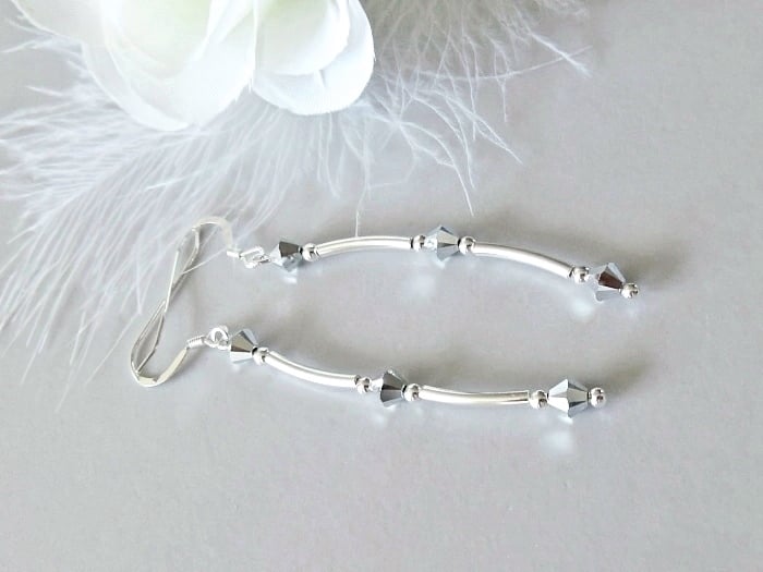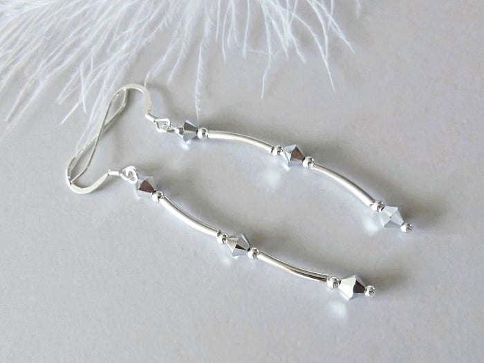 Add some sparkly silver crystal earrings to your jewellery collection with these uniquely designed, handmade earrings. Combining sleek modern geometry with a high level of sparkle, these earrings also feature thick seamless Sterling Silver tubes & beads between each of these hard-to-find mirror-like silver crystals. They shimmer & shine with even the slightest of movements.