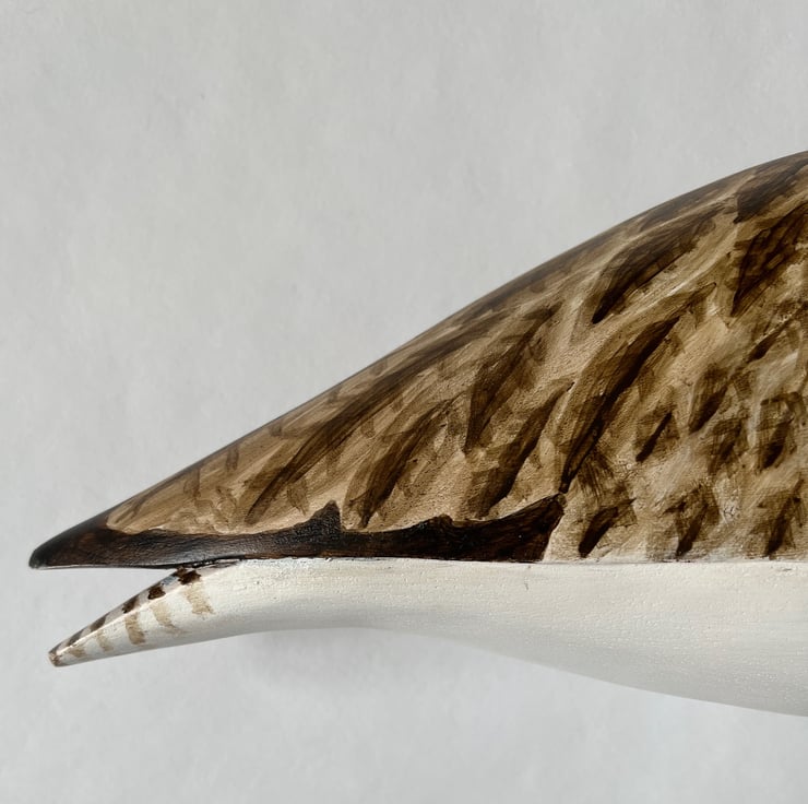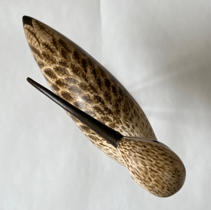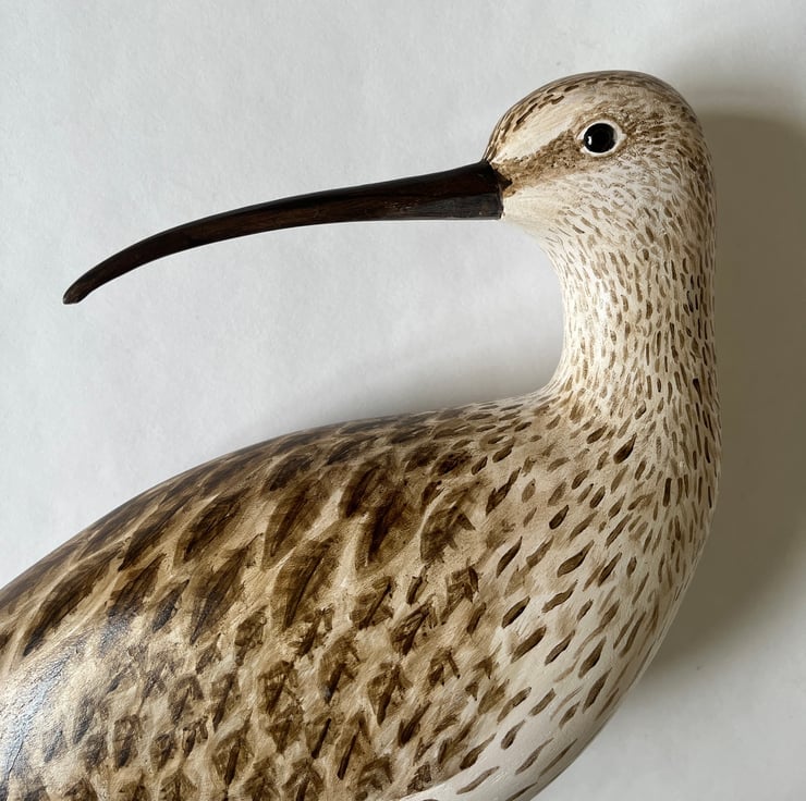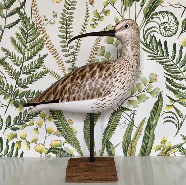 This lovely backwards looking curlew has been hand carved from jelutong and painted using artists acrylics. It has hand coloured glass eyes, split tail detail and is mounted on a pretty piece of driftwood.