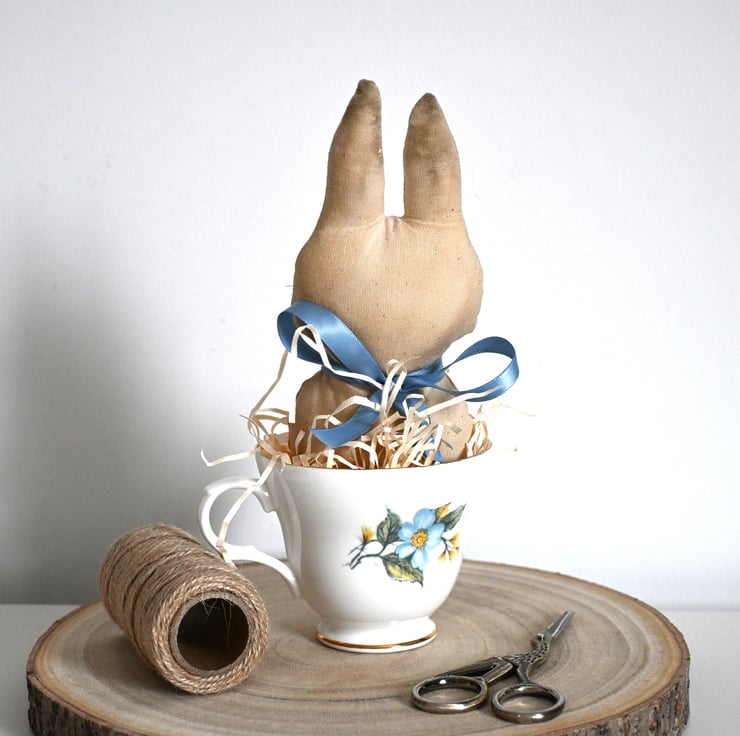 The rabbit has been sewn and hand stained to give a primitive finish, she has a hand embroidered face and whiskers and a little bell tied around her neck with blue ribbon.