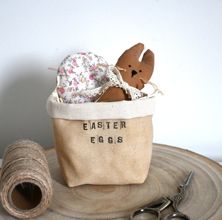 A fabric basket which has been hand stained for a primitive look and stamped with the words 'Easter basket'.