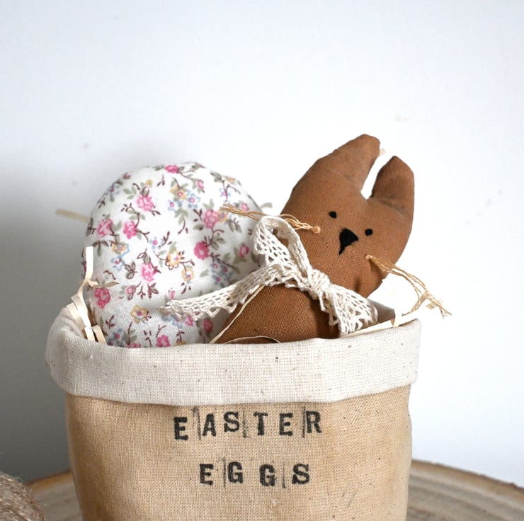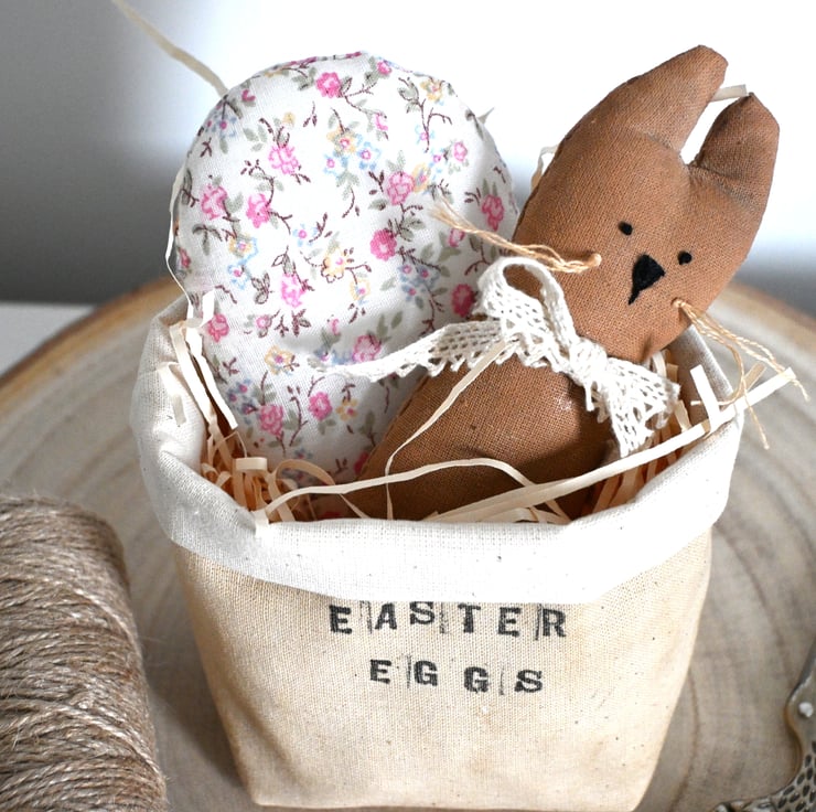 The basket has been filled with paper 'straw' and features a fabric rabbit which has been hand painted, has an embroidered face and a lace ribbon tied around it's neck and a fabric easter egg. Please note these are placed in the basket and can be removed if required.