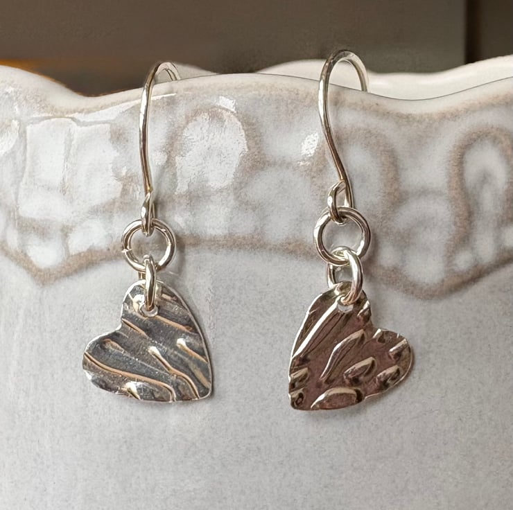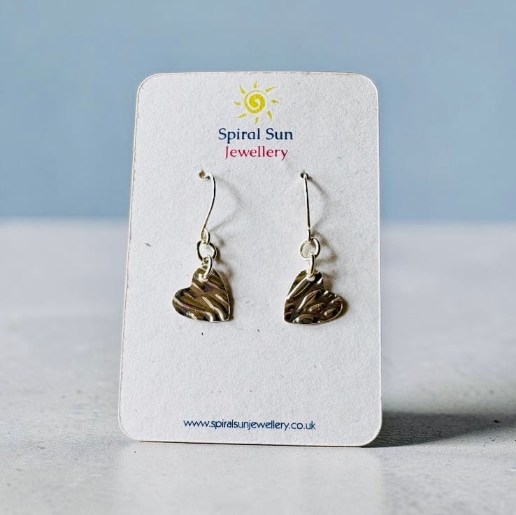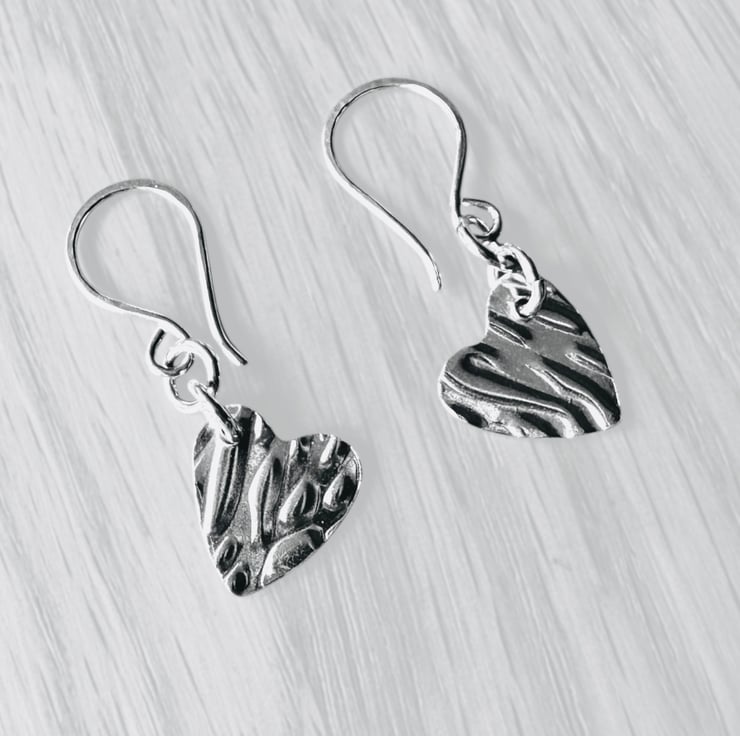These cute little heart earrings are cut from sterling silver sheet and put through the rolling mill to emboss the pattern. They are smoothed and finished and hang from hand made sterling silver earwires.