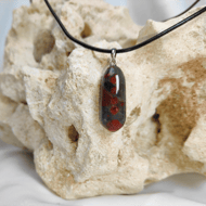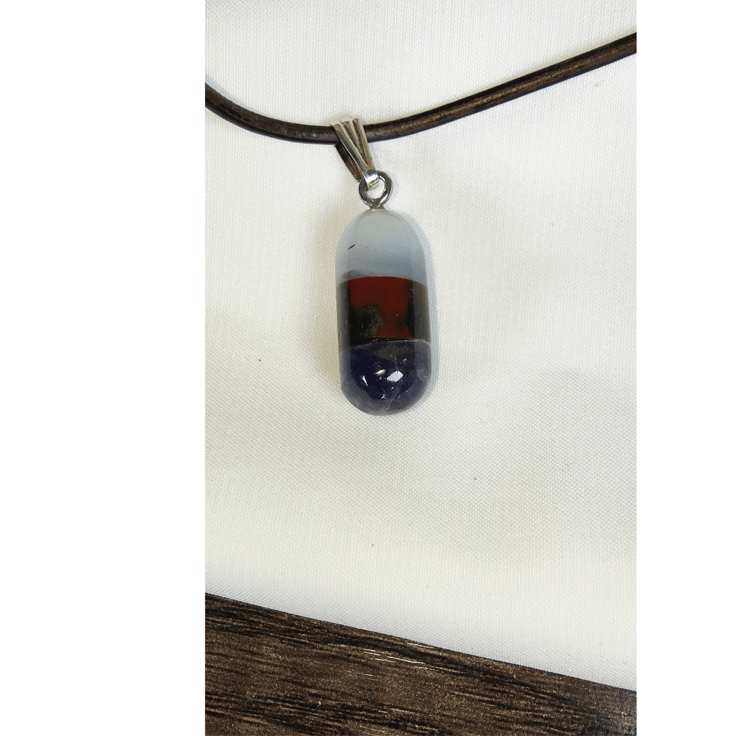 Bloodstone, White Agate, Sodalite sealed together with iron oxide creating a "rust-like" or earthy, dark sealant but also reinforcing strength. Snap Boxed. Fittings; sterling 925 silver fittings on a softened, waxed leather chain. Main screw bail stainless steel.